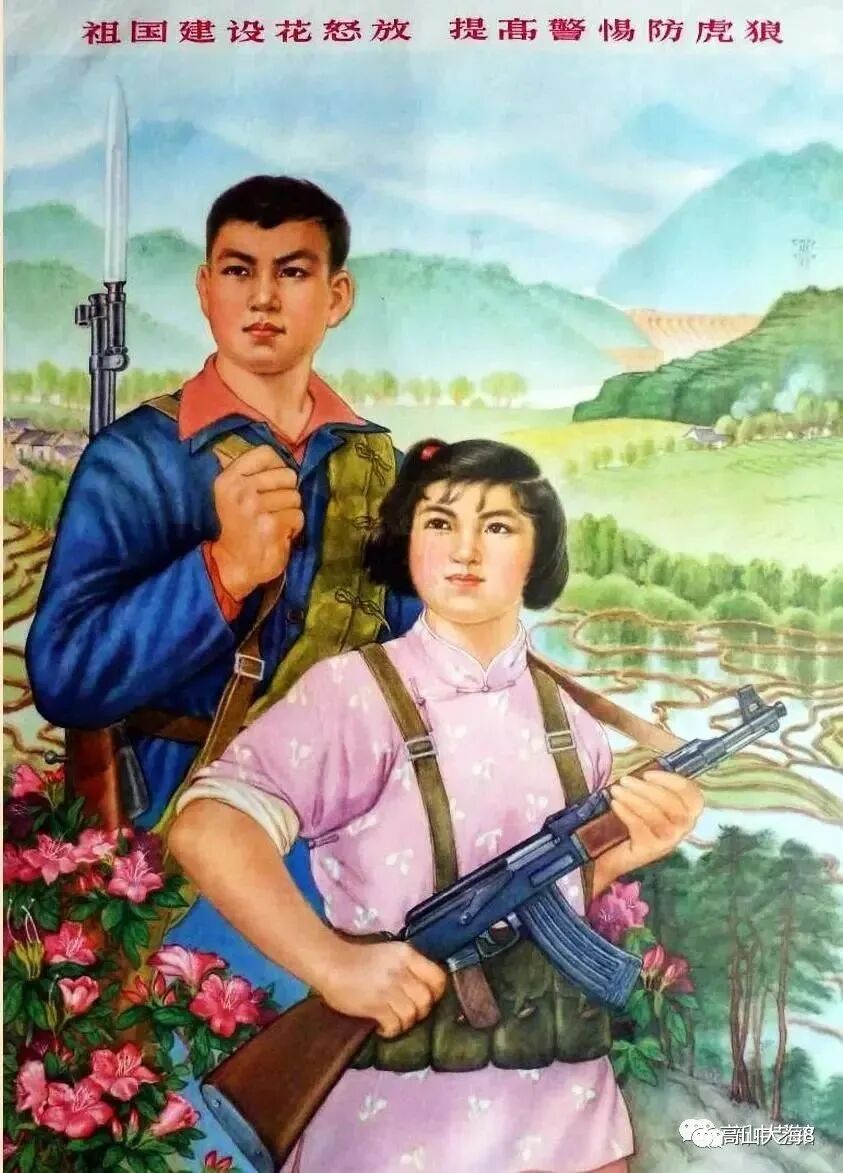 28、1965年出版的《建设祖国花怒放,提高警惕防虎狼》年画,作者是盛此君,一队男女民兵,手握钢枪,英姿飒爽,那时的中国一方面要加大建设的步伐,另一方面还要防备敌人的觊觎。