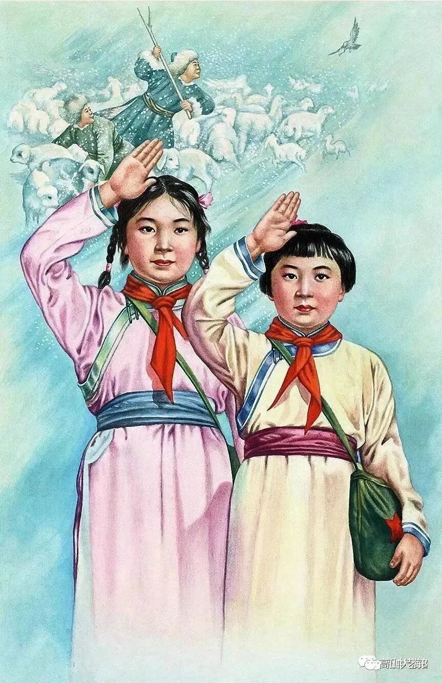 9、1966年出版的《草原英雄小姐妹》年画,作者是李慕白,1964年2月9日,内蒙古自治区达尔罕茂明安联合旗的草原上,12岁的龙梅和9岁的妹妹玉荣一起放养着公社的羊群,突然遇到暴风雪,三百多只羊奔逃,姐妹俩为了不让羊群走散,竟然一夜里走了30多公里地,从而被严重冻伤,后来经过营救,两个孩子脱离了生命危险,但是姐姐龙梅失去了左脚拇趾,妹妹玉荣双腿不同程度被截肢,由于她们勇救集体的羊群,从而被授予“草原英雄小姐妹”的称号。