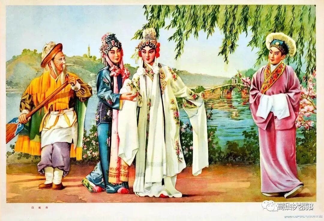 30、1963年出版的《白蛇传》年画,作者是金肇芳,画面绘就了西湖断桥旁,白娘子与许仙相遇时的情景。