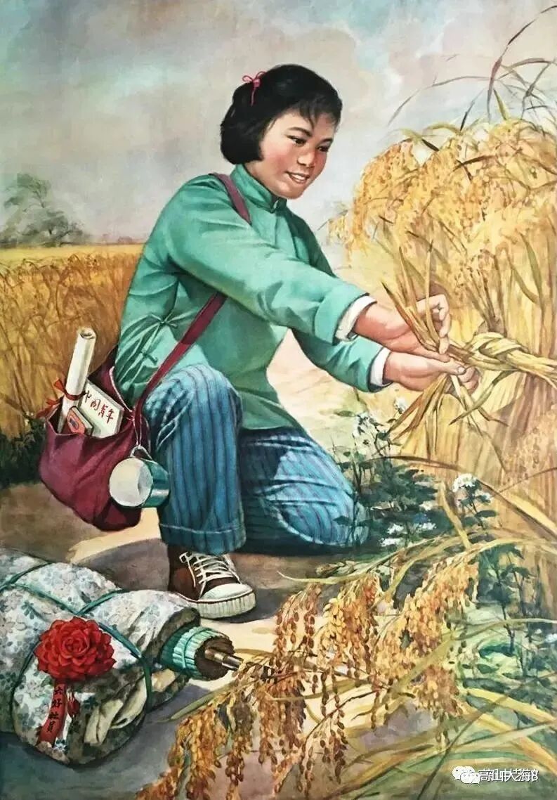 7、1964年出版的《六好社员》年画,作者是马乐群,一个女知青,深入农村,在田间地头忙碌着,践行着六好社员的要求:“在生产队中信念坚定不移,对党忠心耿耿,积极参加农业劳动,不怕脏不怕累,帮助农村搞好宣传工作”