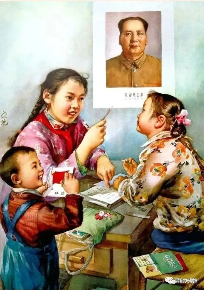 11、1964年出版的《做毛主席的好孩子》年画,作者是谢之光,在一个课桌旁,姐姐正在教着妹妹做功课,铅笔指向墙上的毛主席画像,告诉妹妹大家都要做个好孩子,旁边的小弟弟乐呵呵的,手里拿着认字的书,上面是鲜红的红旗,五十多年的时光已经过去,也许有些读者朋友还能回忆其这样的场景。