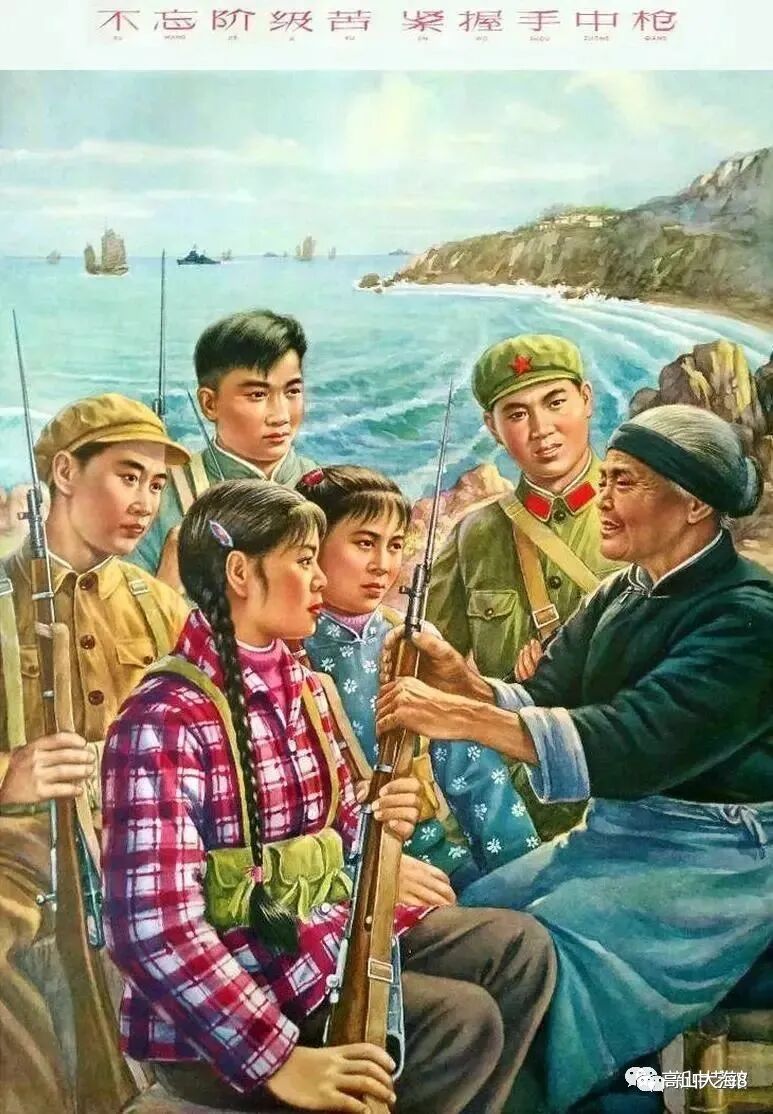 紧握手中枪》年画,作者是忻礼良,在一处海岛的训练场,解放军战士和民兵们围在一起,听着老妈妈讲述旧社会的痛苦生活,只有紧握钢枪,才能保住得来不易的新社会。
