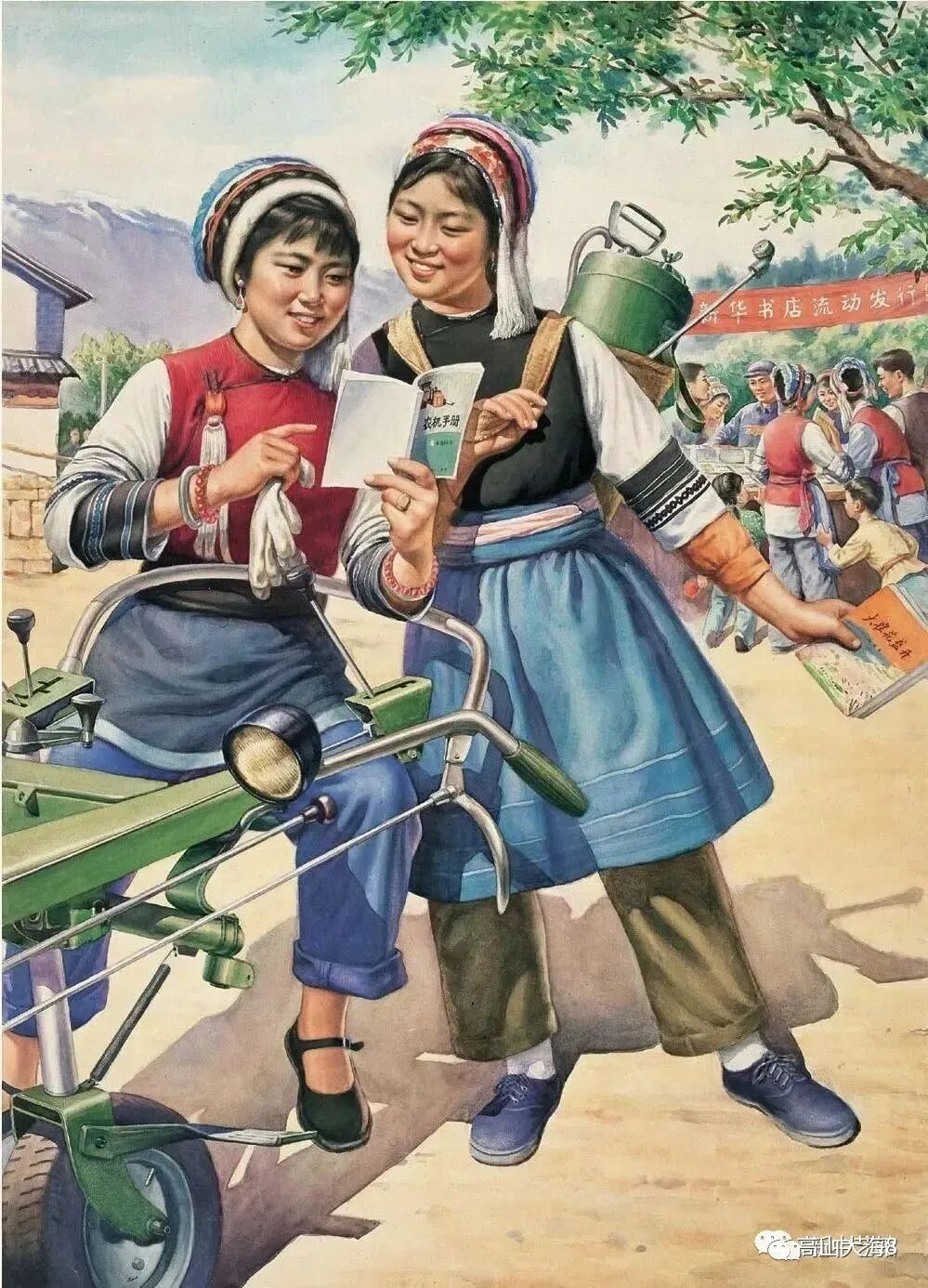 21、60年代出版的《迎新书》年画,作者是黄妙发,在一个少数民族村寨,新华书店的流动服务点,围满了村民,坐在手扶拖拉机旁的女子,一人拿着《大寨花盛开》的书,另一个拿着《农机手册》认真的读着。