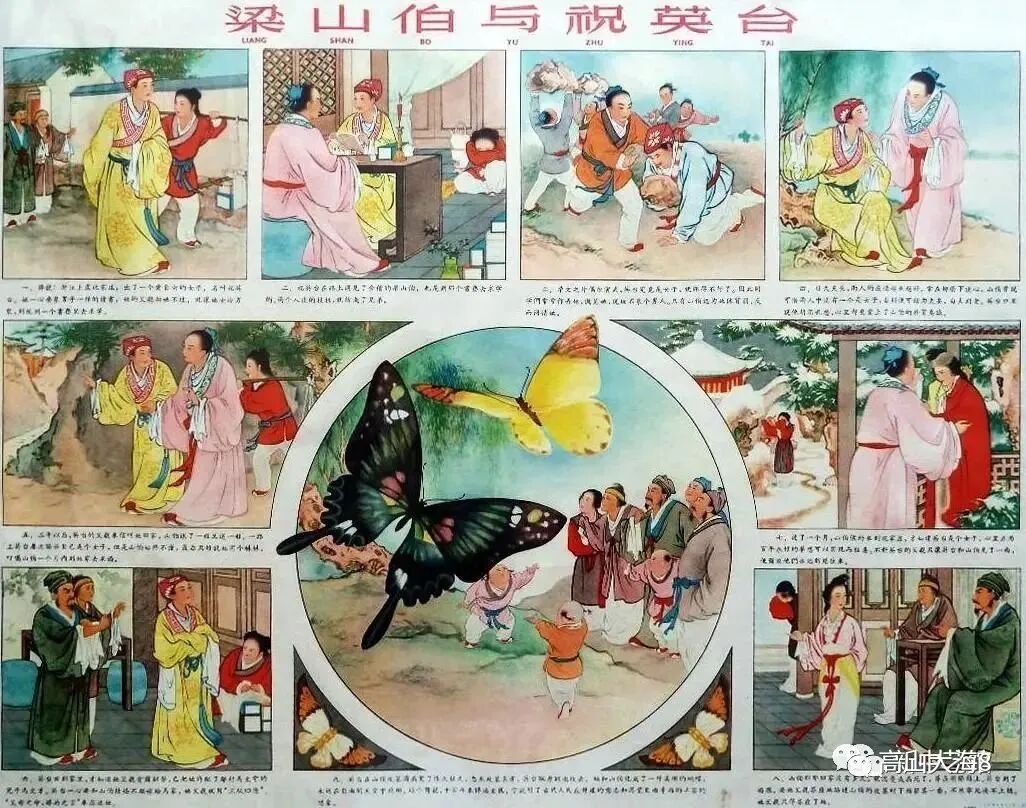 27、1963年出版的《梁山伯与祝英台》年画,作者是王叔晖,这张年画以组图的方式,图文并茂描述了梁山伯与祝英台之间的爱情故事。