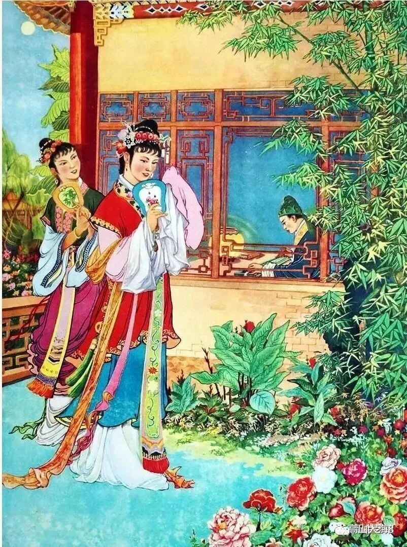 18、1962年出版的《莺莺听琴》年画,作者是邱小玉,取自西厢记的场景,夜色下,月光如水,崔莺莺在红娘的陪伴下,正在墙壁处听着张生弹起了古琴。