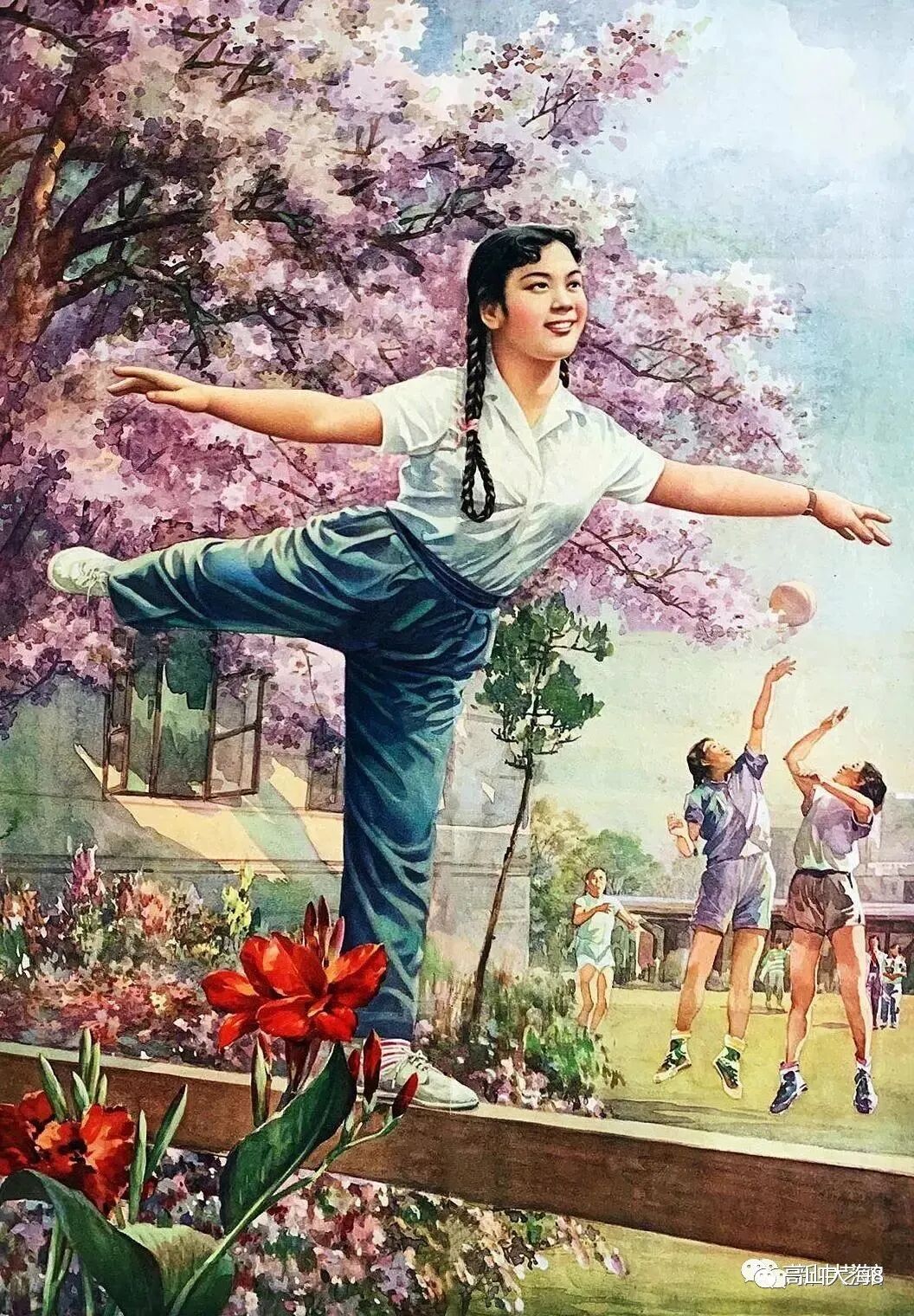 14、1963年出版的《平衡木运动》年画,作者是金梅生,在校园的运动场上,健硕的蓝球女队员正在抢着空中的篮球,教学楼的转角处,平衡木上,一位可爱的女体操运动员,露出自信的笑容,张开了双臂,像一只鸟儿一样翱翔。