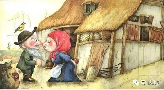 老太婆说:“谢谢你,我的好丈夫!”她说完这话后就在他的嘴上接了一个响亮的吻。