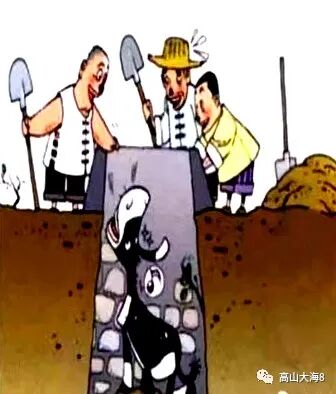 农夫请来左邻右舍,人手铁铲一把,开始填井埋驴,以免除驴之痛苦煎熬。