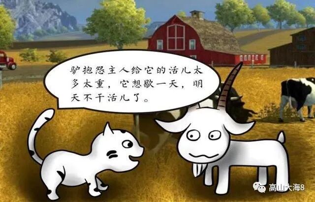 猫转身对羊说:“驴抱怨主人给它的活儿太多太重,它想歇一天,明天不干活儿了。”