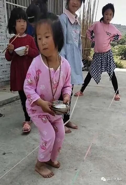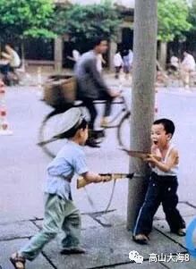 女孩跳皮筋,男孩玩木枪。