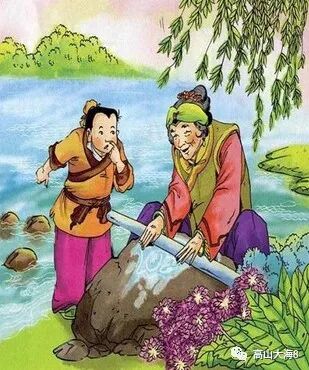 他来到山下小河边,见到一位老婆婆在石头上磨一铁杵。
