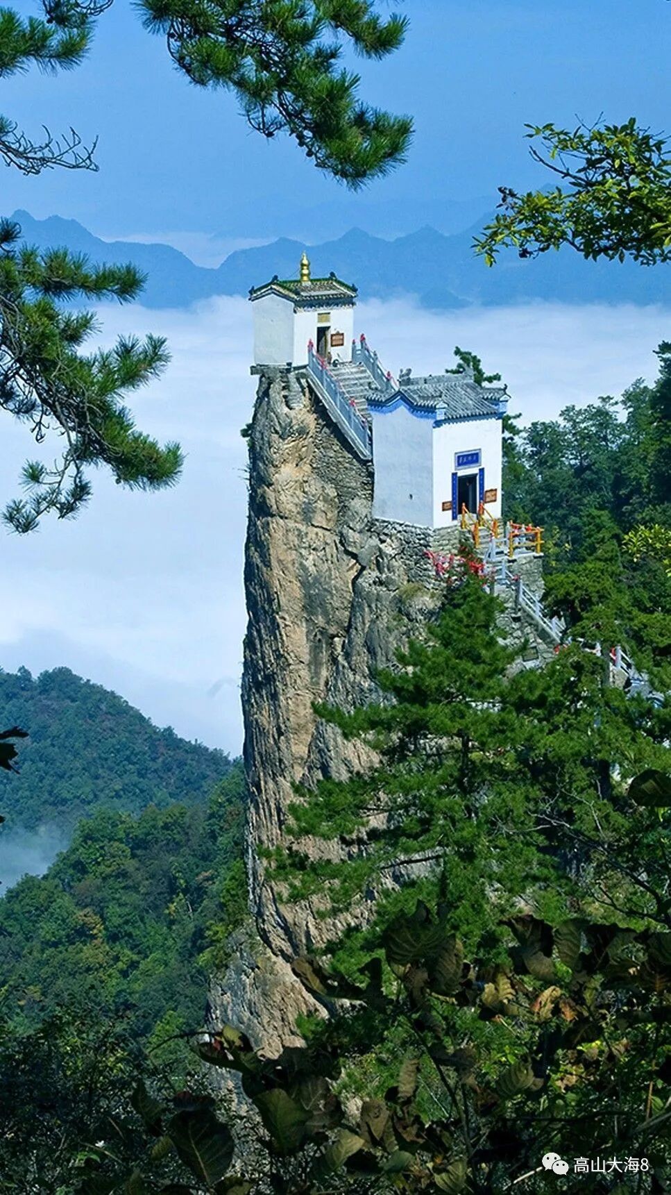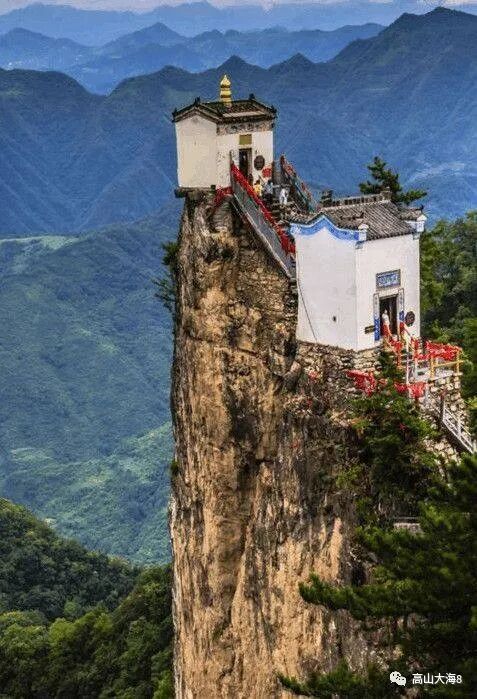 观音殿,素有金鼎刺青天,松海云雾间的美誉,坐落于陕南塔云山中,主峰海拔1665.8米,形似宝塔,殿宇建于塔云山绝顶之上,由一馆-一堂-一庙-一塔-九殿组成,三面都是万丈悬崖,被称为秦楚一柱,绝顶道观,金顶观音殿已有500多年的历史,孤独地站在1500多米的悬崖上,被称为天下最险的道观,尤其是这里的云海,一天的时间变幻多端,美不胜收。