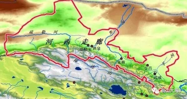 河西走廊又称甘肃走廊,其南为海拔四、五千米的祁连山脉。其由一系列北西走向的高山和谷地组成,西宽东窄,由柴达木盆地至酒泉之间为最宽,约300公里。祁连山山峰海拔多在4,000米以上,最高峰疏勒南山团结1峰海拔为6,305米,这基本上接近了青藏高原大多数山峰的高度。祁连山北侧和南侧分别以大起大落的明显断裂由高山一下降至平原,北坡与河西走廊的相对高度在2,000米以上,而南坡与柴达木盆地间仅1,000多米。在祁连山4,500米以上的高山上,有着丰厚的永久积雪和史前冰川覆盖,这些积雪和冰川在每年特定的季节融化,为这一地区大量的绿洲和耕地提供了源源不断的源头活水。