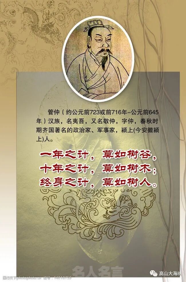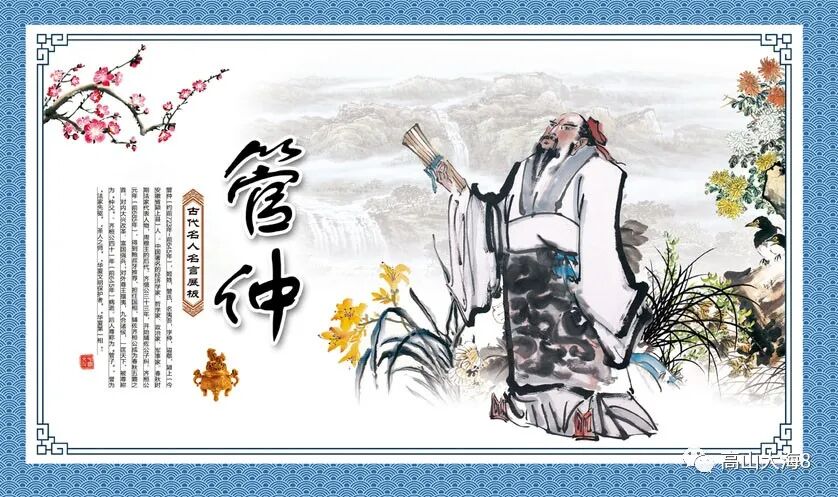 管仲(前719一前645年),姬姓,管氏,名夷吾,字仲,谥敬,被称为管子、管夷吾、管敬仲,华夏族,颍上(今安徽省颍上县)人,周穆王的后代。是中国古代著名的军事家、政治家、经济学家、改革家。管仲的著作今称《管子》,内容涵盖各种学术,是后世道家、儒家、名家、法家、农家、兵家、阴阳家等等多家学术思想的源头。