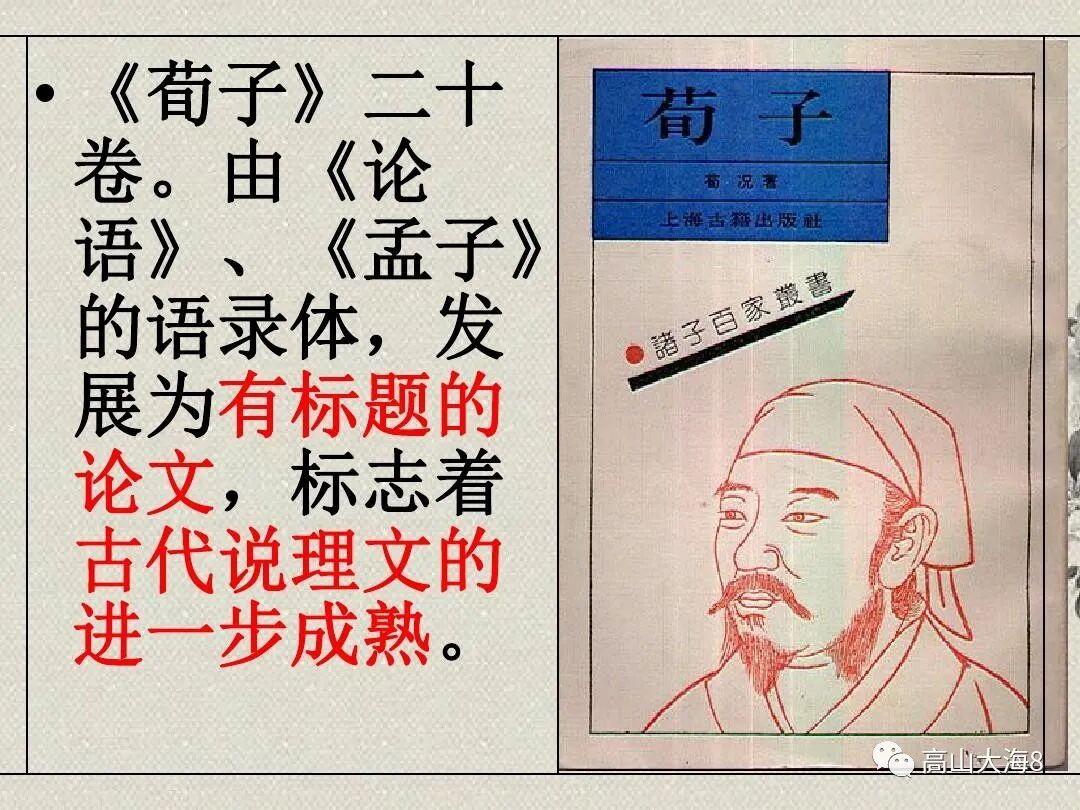 荀子(约前313-前238),名况,时人尊而号为“卿”,西汉时为避汉宣帝刘询讳,又称孙卿,因“荀”与“孙”二字古音相通。战国末期赵国猗氏(今山西安泽县)人,先秦儒家后期的代表人物。曾两次到当时齐国的文化中心稷下(今山东临淄)游学,担任过列大夫的祭酒(学宫领袖)。还到过秦国,拜见了秦昭王。后来到楚国,任兰陵(今属山东)令。荀子对儒家思想有所发展,提倡“性恶论”,其学说常被后人拿来跟孟子的“性善说”比较。荀子对重新整理儒家典籍也有相当显著的贡献。与其弟子撰有《荀子》一书。