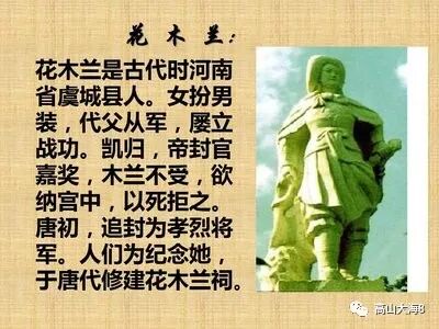 这首诗塑造了木兰这一不朽的人物形象,既富有传奇色彩,而又真切动人。木兰既是奇女子又是普通人,既是巾帼英雄又是平民少女,既是矫健的勇士又是娇美的女儿。她勤劳善良又坚毅勇敢,淳厚质朴又机敏活泼,热爱亲人又报效国家,不慕高官厚禄而热爱和平生活。