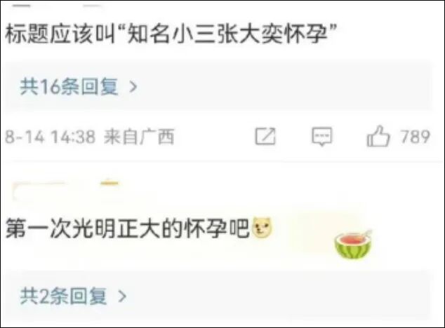 也有网友在视频下面呛张大奕,说标题应该叫“知名小三张大奕怀孕”。