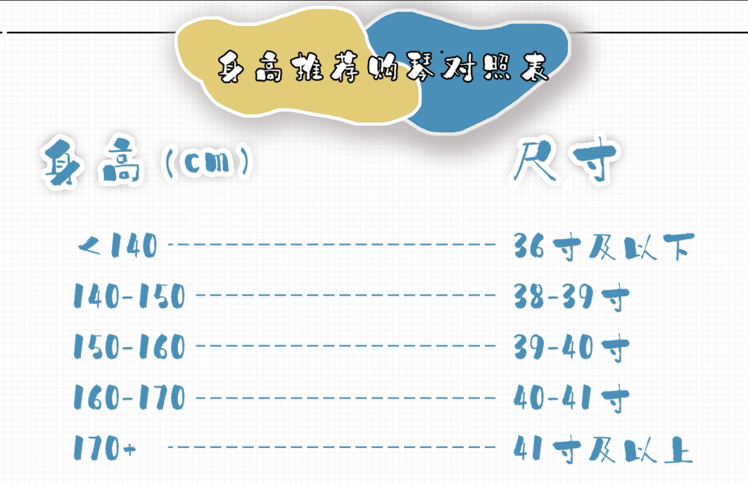 买琴的时候看到的34、36、40、41寸等,都是指乐器的整体尺寸。一般来说,入门的时候只需参考这个尺寸,这里有一个表格,可以给不同身高的用户参考适合自己的吉他尺寸。