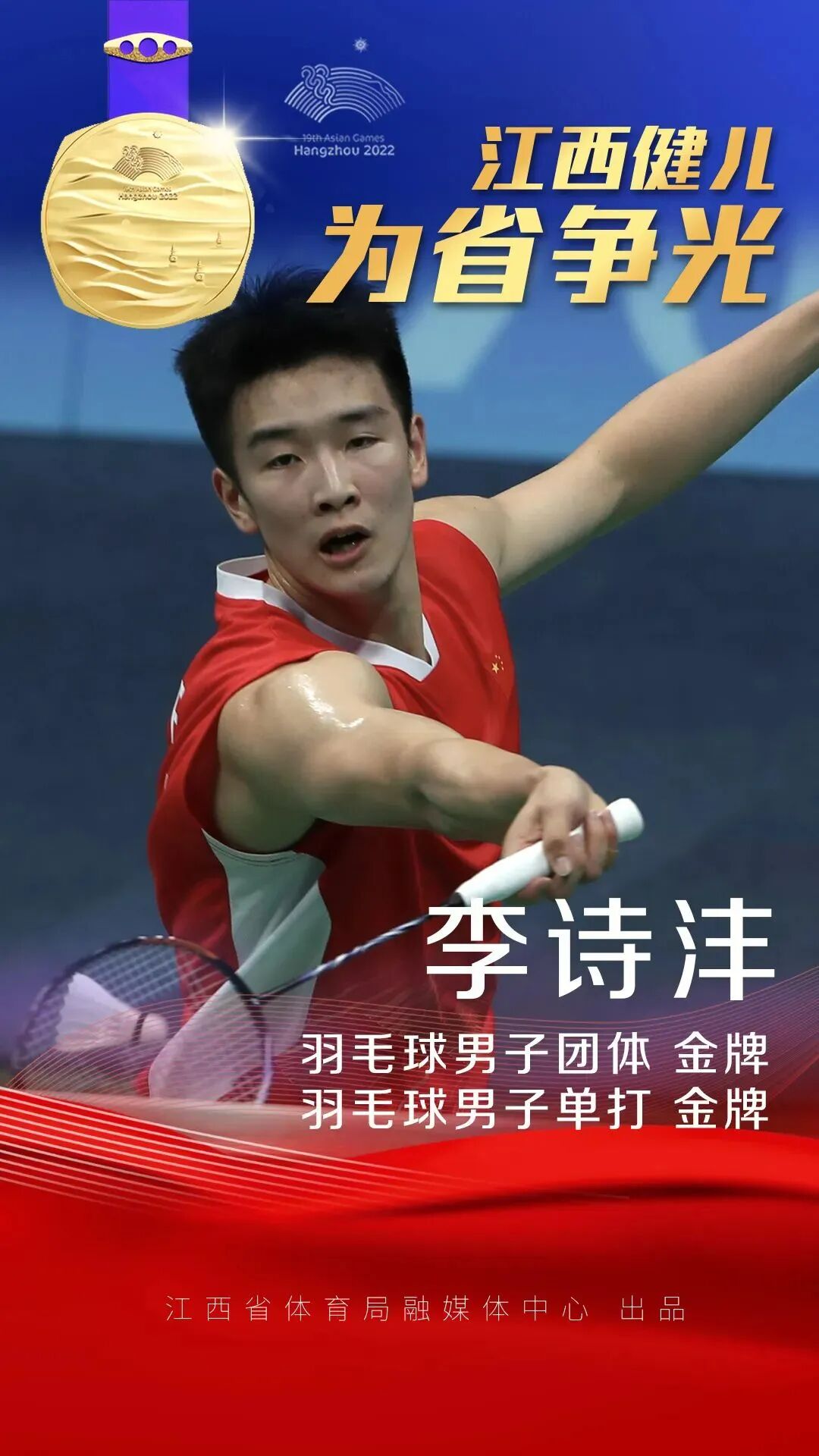 10月1日,在男子羽毛球团体决赛中,江西运动员李诗沣助力中国队勇夺男子羽毛球团体冠军,获得一枚金牌。随后又在羽毛球男子单打冠亚军争夺战中,击败石宇奇成功夺得羽毛球男子单打冠军,再次获得金牌。