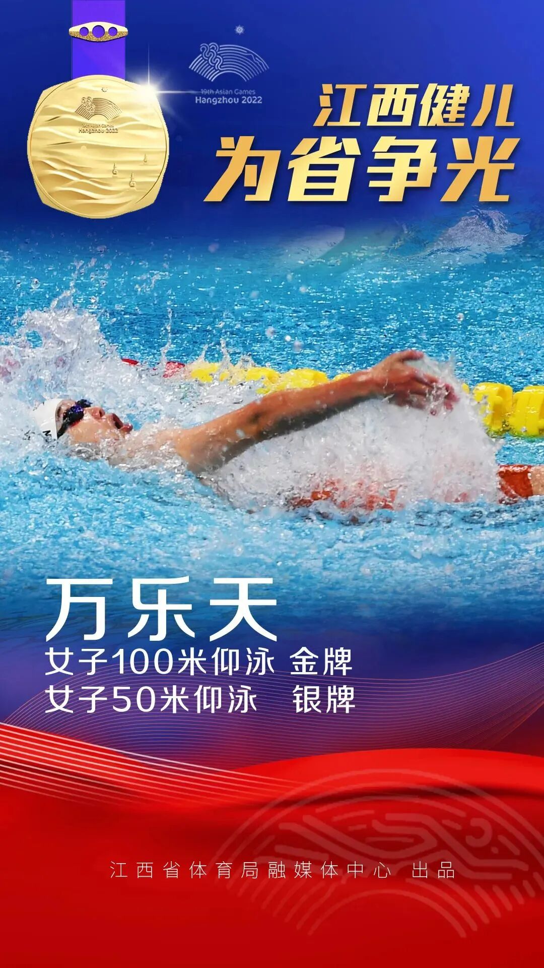 9月25日晚,在女子50米仰泳决赛中,江西运动员万乐天以27秒41的成绩,获得该项目银牌。9月27日晚,在女子100米仰泳决赛中,万乐天以59秒38的成绩,勇夺该项目金牌。