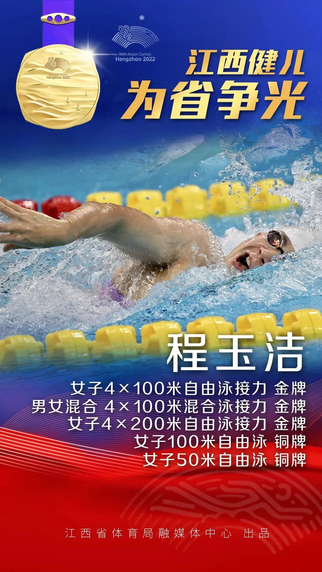 9月28日晚,在女子50米自由泳决赛中,江西运动员程玉洁以24秒60的成绩夺得该项目铜牌。9月28日晚,在女子4×200米自由泳接力赛中,由柳雅欣、程玉洁、李冰洁和李家萍组成的中国队以7分49秒34的成绩获得该项目金牌。