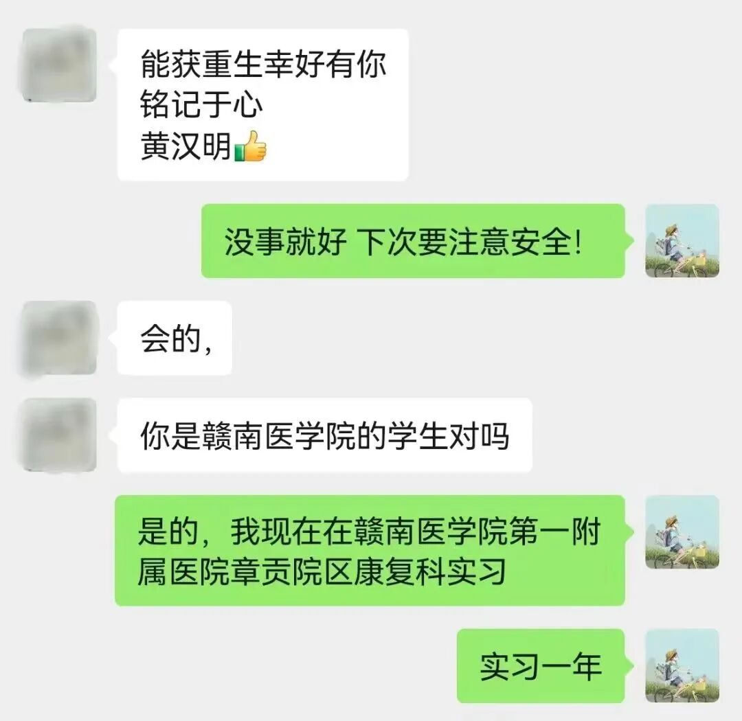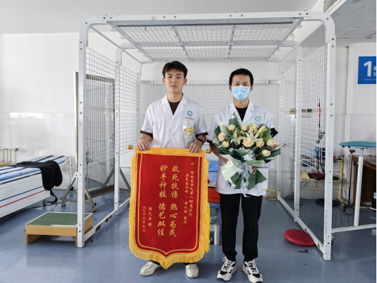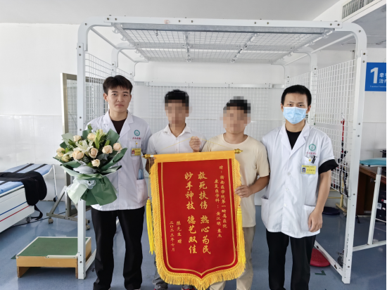 “还好有你们的救助,挽救了我的生命,感谢你们!”7月17日上午,在赣南医学院第一附属医院章贡院区康复医学科,溺水后出院的陈先生紧紧握住黄汉明、袁杰同学的双手激动地说道,并将写有“救死扶伤,热心为民;妙手神技,德艺双佳”字样的锦旗送给两位同学。