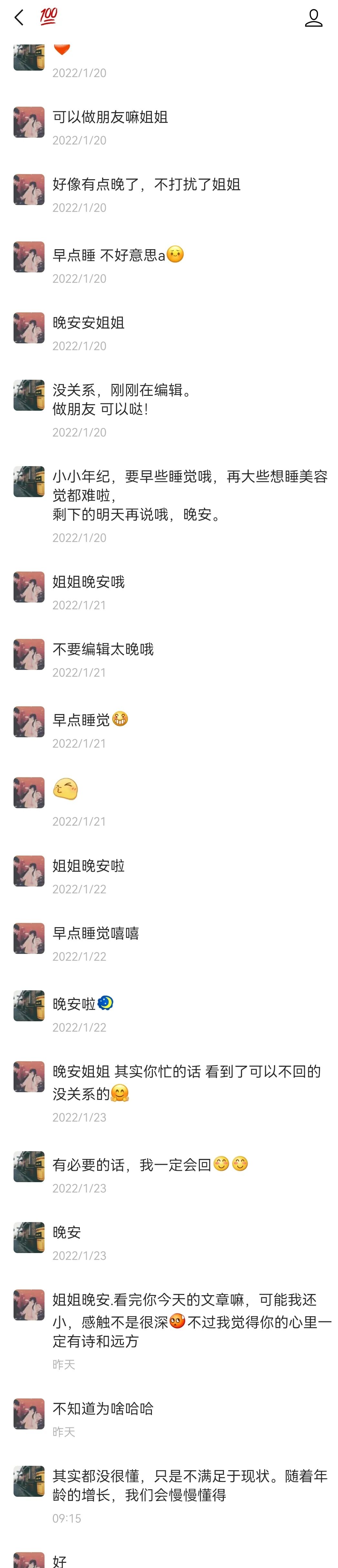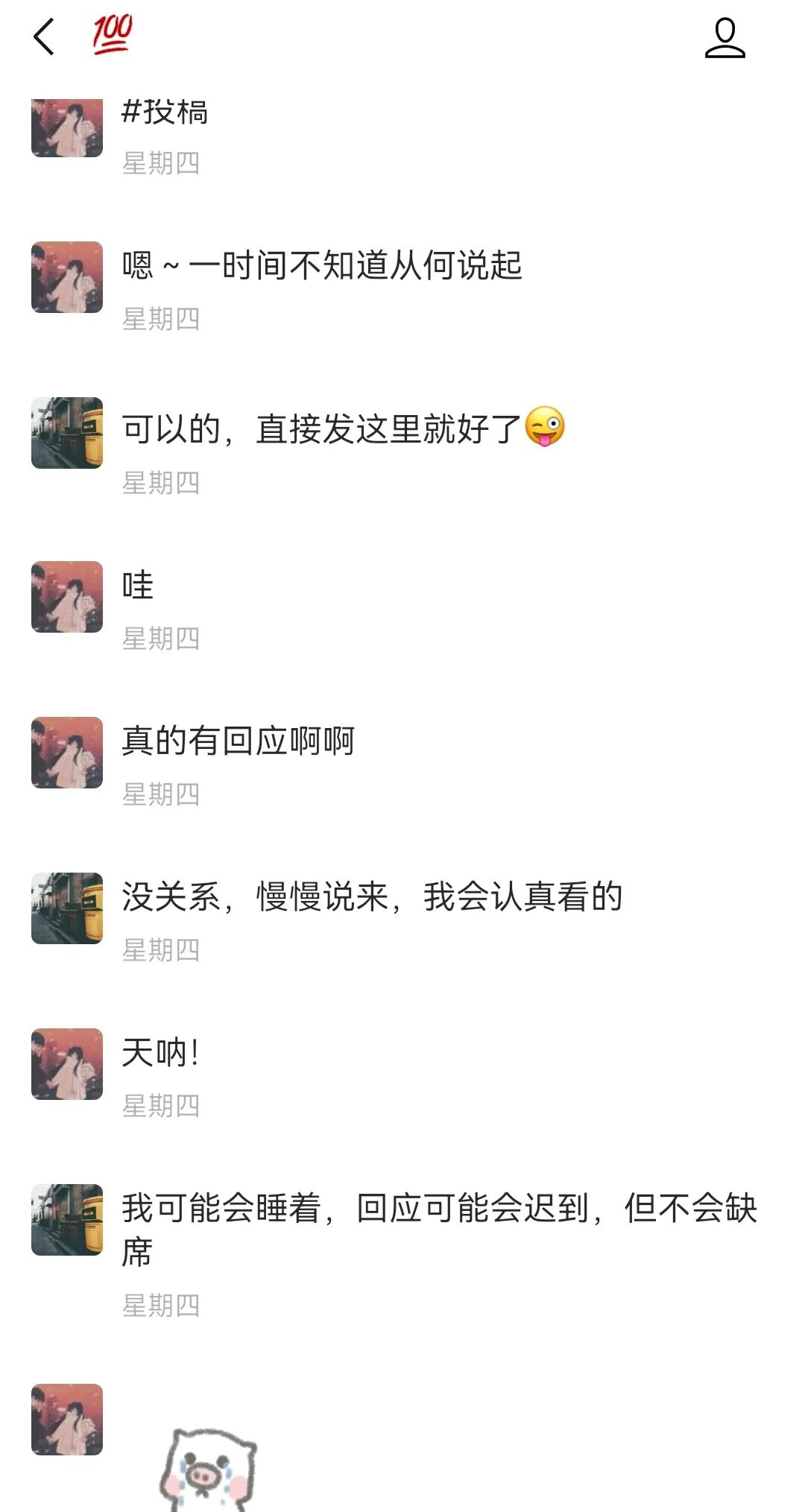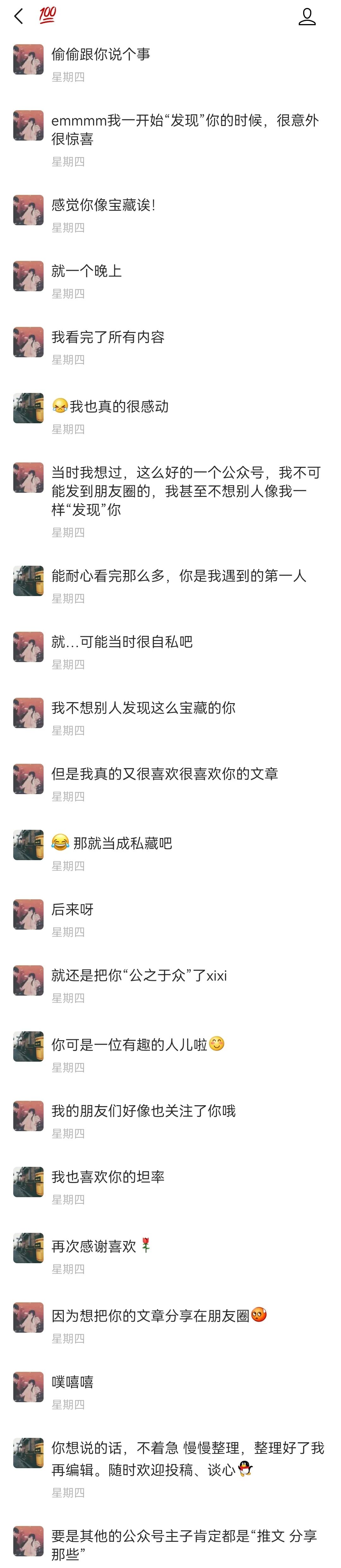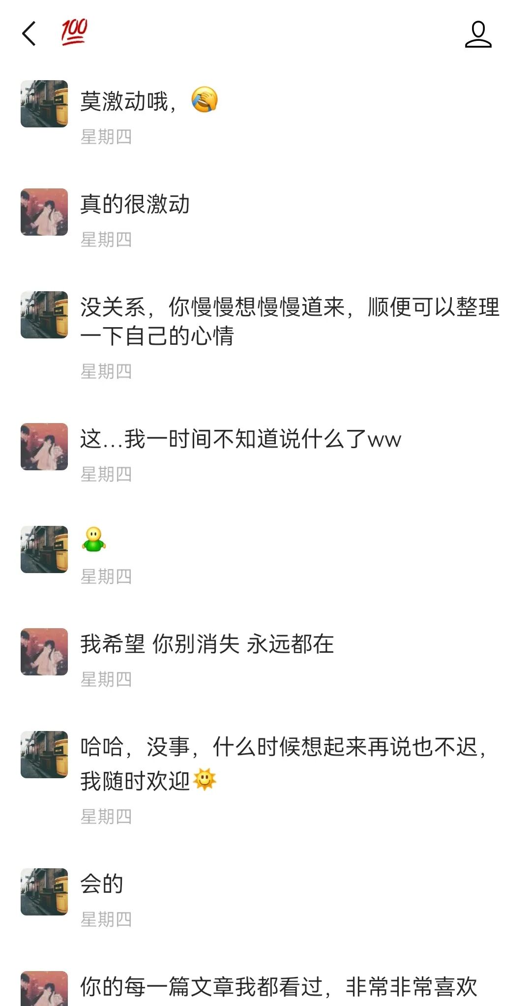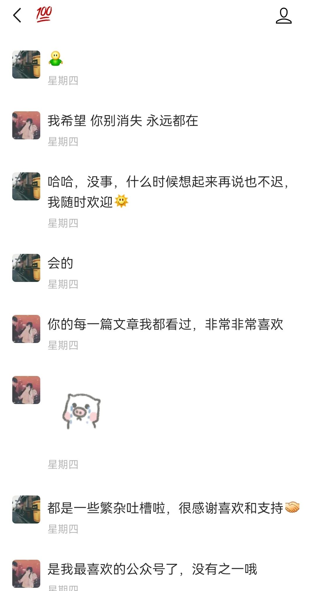 这段对话我不知道在别人眼里会被理解成什么样,但在我心里,是一次信任、一次鼓励,也是对我坚持下来的奖励。一次微妙的相遇,足以让我欣喜若狂。我经常怕留言回复迟到了,会被读者否定掉,现在发现,这个担心真的多余,有些遇见像是被刻意安排似的,我说「或许我会迟到,但不会缺席」,便得到了「你要是忙的话,可以先不用回复我」;蛮感动的。