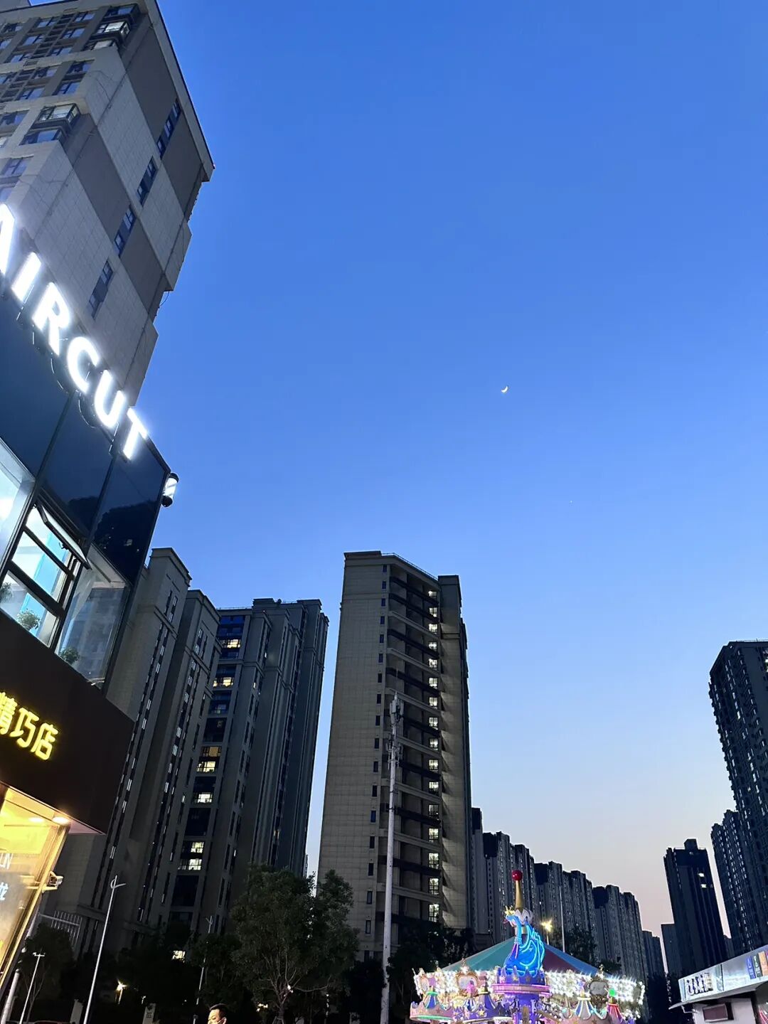 转身看到夜晚七点多的昏蓝色的天空上挂着一轮明月,明月下的旋转木马放着歌谣,一群孩童在不知苦痛的年纪里尽情玩耍。