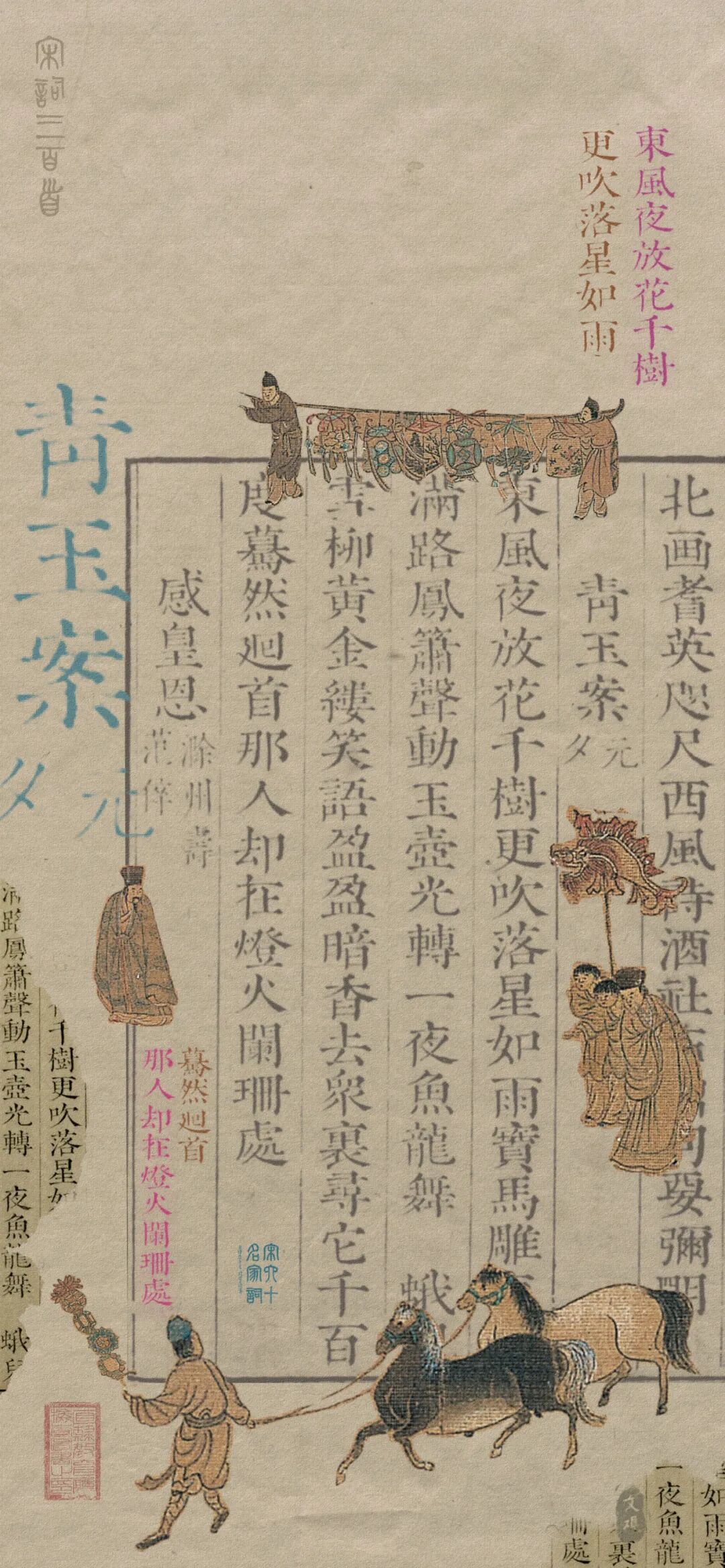 诗的上阕主要描绘了元宵节的热闹景象。东风夜放花千树,形容灯火辉煌,如同春天的花开满城。更吹落星如雨,则将烟火比作流星雨,富有想象力。宝马雕车香满路,描述了车水马龙的繁华街道。凤箫声动,玉壶光转,一夜鱼龙舞,展示了民间艺人们载歌载舞、鱼龙漫衍的“社火”百戏,极为繁华热闹。