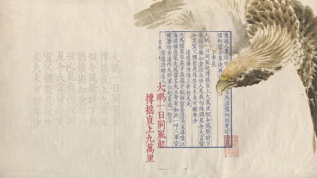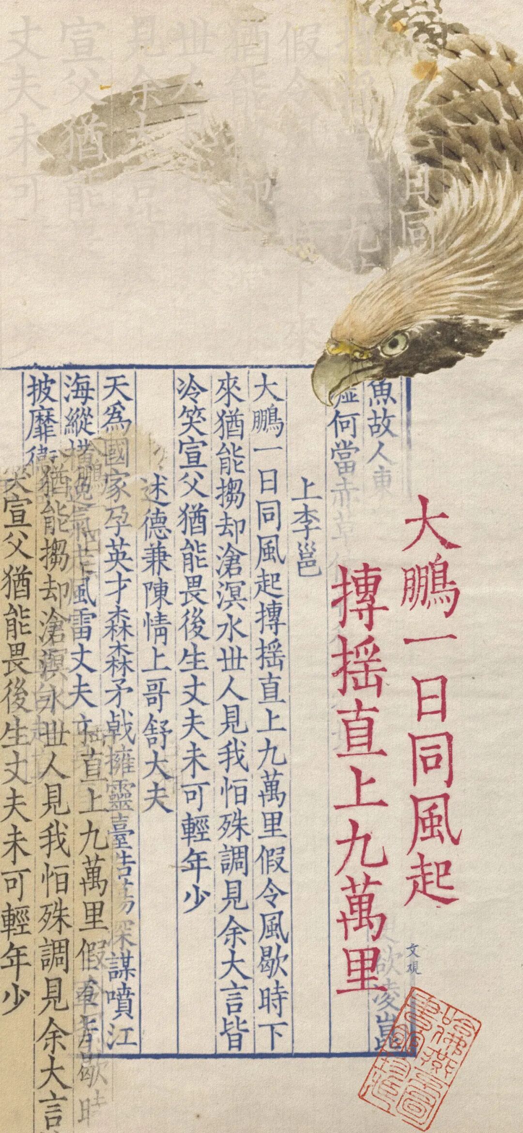 诗中的“大鹏”形象源于庄子的《逍遥游》,其中描述了大鹏迁徙到南海时激起三千里水花、翅膀拍打旋风直达九万里高空的壮丽场面。而李白在此基础上,进一步将大鹏形象化为自己的人生追求和理想境界。