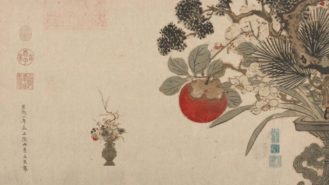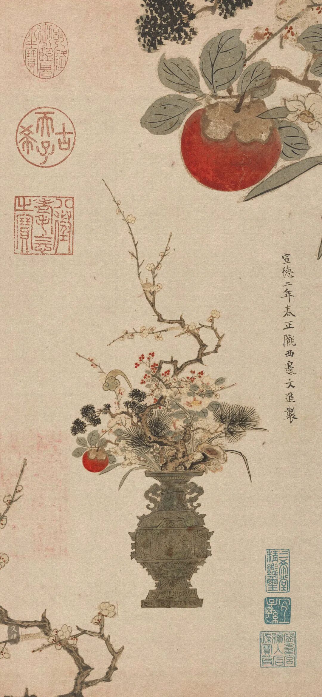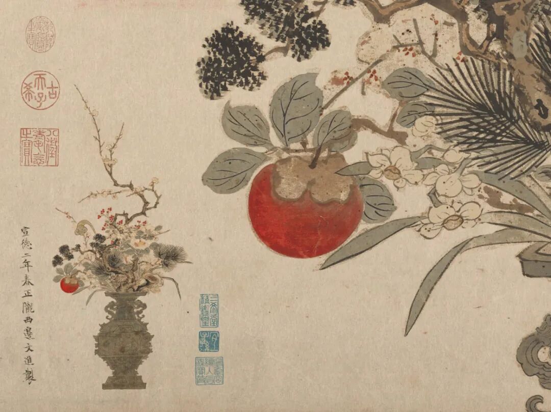 这幅作品由明代宫廷画家边文明所作。图中包含了十种花卉和树木,如柿子、如意、梅花、兰花、山茶花、水仙、松枝、柏树、灵芝、天竺等,寓意着“百事如意”和“十全十美”。