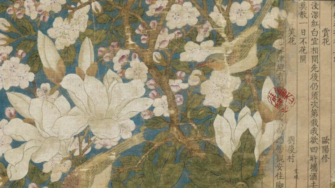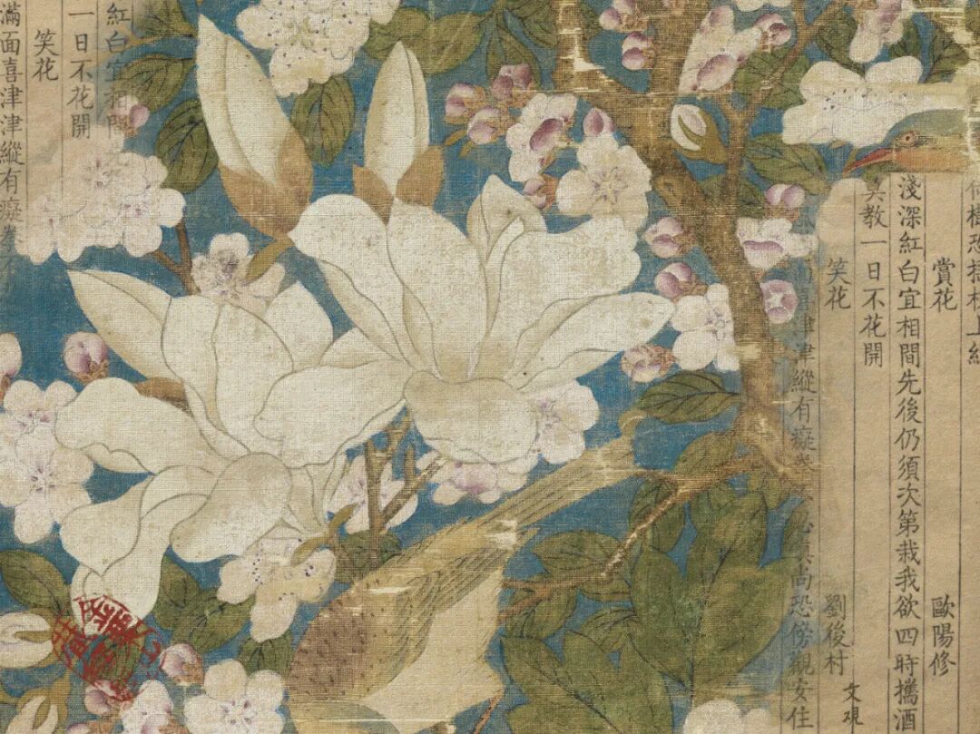 画作右下角描绘了假山石,然后以玉兰为主干,中部则画了象征富贵的大朵牡丹花,并穿插了海棠和杜鹃。枝间叶下还画有穿梭似的小鸟,假山下画有一只露出前半身的野雉。