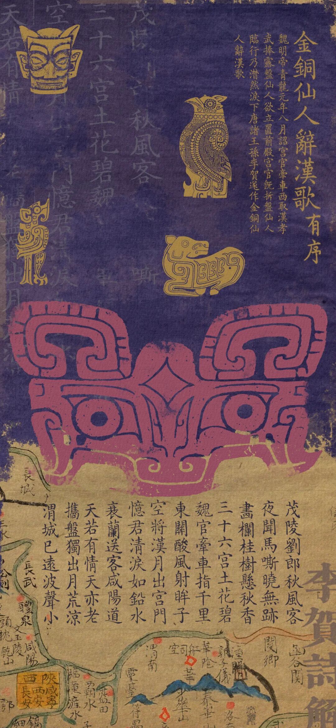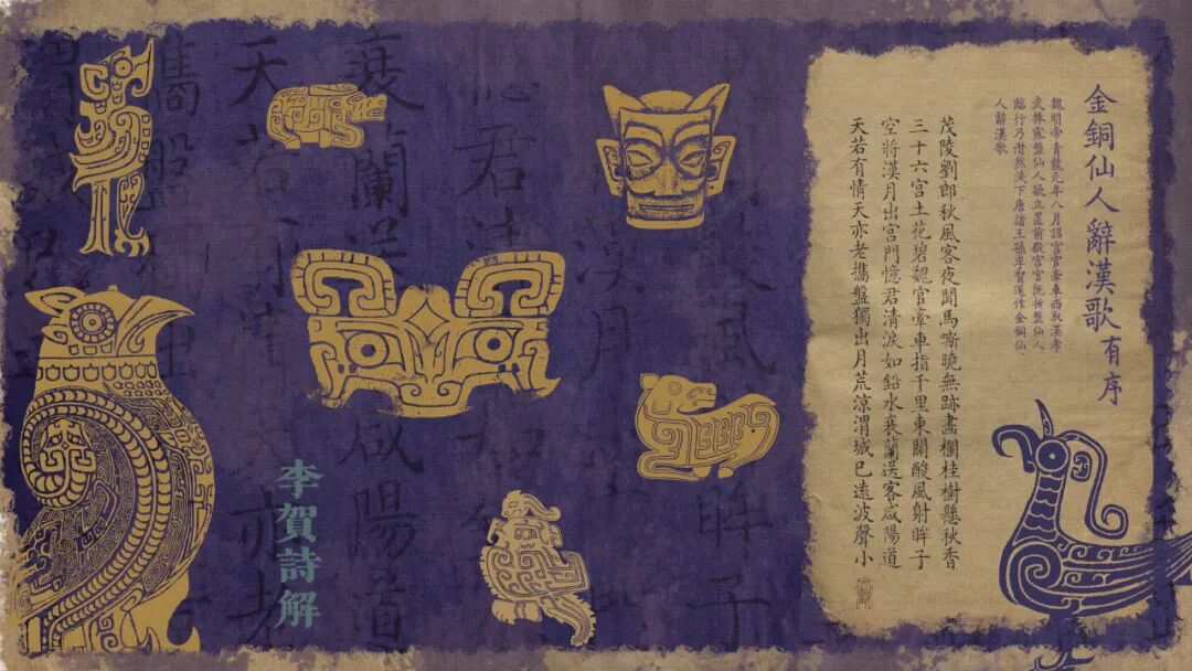 《金铜仙人辞汉歌》是一首七言古诗,作者借金铜仙人辞汉的史事,抒发了兴亡之慨、家国之痛和身世之悲。全诗共十二句,可分为三个部分。前四句感叹韶华易逝,人生难久;中间四句以拟人手法描写金铜仙人初离汉宫时的凄婉情态;末四句则写出城后途中的情景。此诗想象奇特,情感深沉感人;形象鲜明,变幻多姿;词句奇峭,又妥帖绵密,充满浪漫主义色彩。