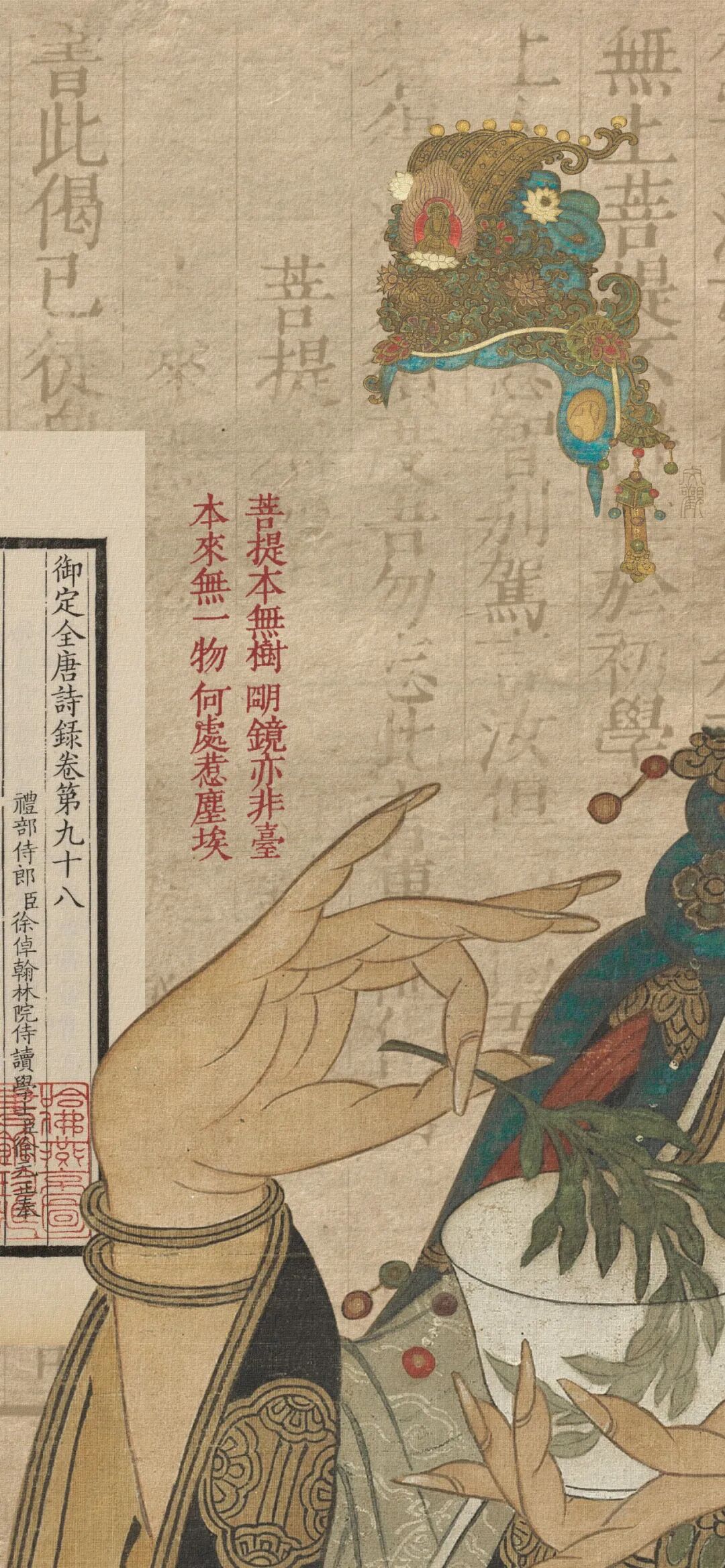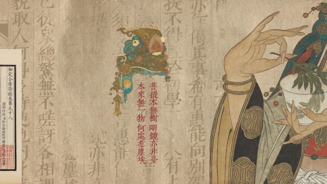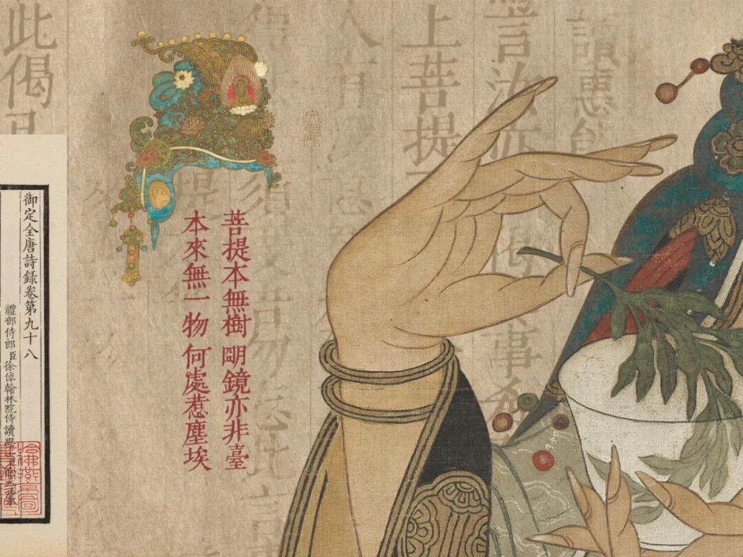 上首弟子神秀渴望继承衣钵,在墙上写下了一首佛偈:"身是菩提树,心为明镜台。时时勤拂拭,勿使惹尘埃。"这首诗表达了他的观点,即需要时刻关注和保护自己的心性,通过不断的修行来抵御外界的诱惑和邪恶,这是一种强调修行过程的入世心态。