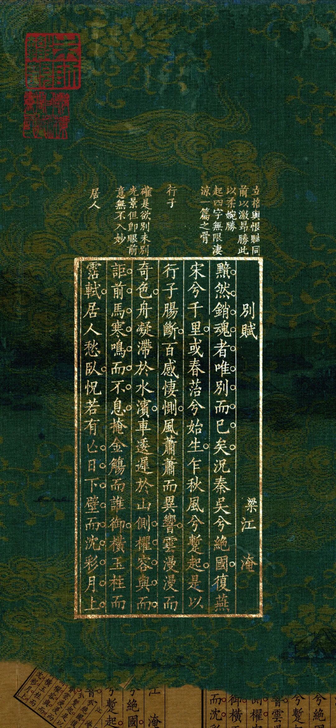 黯然销魂者,唯别而已矣!况秦吴兮绝国,复燕宋兮千里。或春苔兮始生,乍秋风兮暂起。是以行子肠断,百感凄恻。风萧萧而异响,云漫漫而奇色。舟凝滞于水滨,车逶迟于山侧。棹容与而讵前,马寒鸣而不息。掩金觞而谁御,横玉柱而沾轼。居人愁卧,怳若有亡。日下壁而沉彩,月上轩而飞光。见红兰之受露,望青楸之离霜。巡层楹而空掩,抚锦幕而虚凉。知离梦之踯躅,意别魂之飞扬。