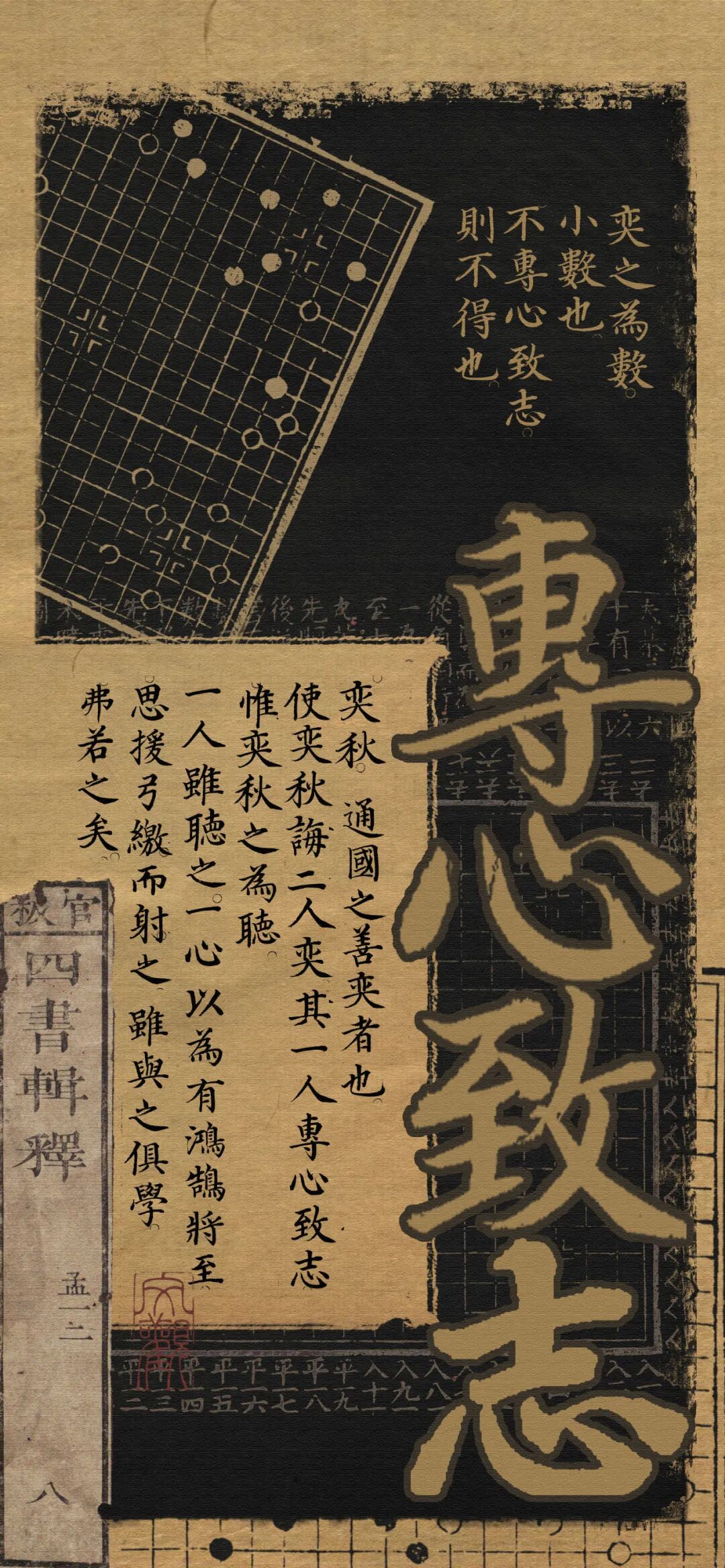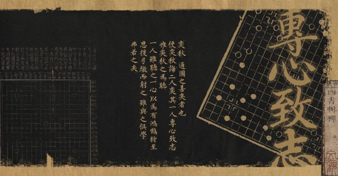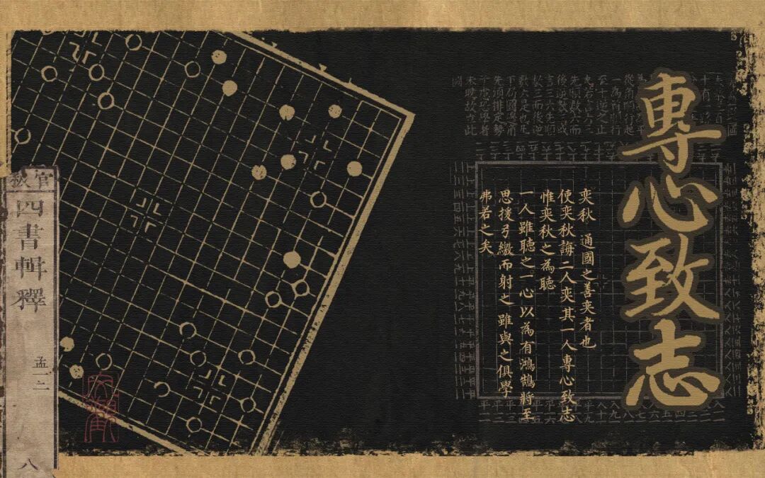 弈秋是全国最擅长下棋的人。让弈秋教导两个人下棋,其中一人专心致志地学习,只听弈秋的教导;另一个人虽然也在听弈秋的教导,却一心以为有大雁要飞来,想要拉弓箭将它射下来。虽然他们二人一起学习下棋,但后者的棋艺不如前者好。难道是因为他的智力比别人差吗?说:不是这样的。