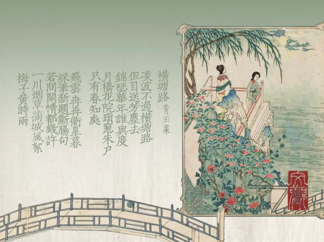 她轻盈的脚步没有越过横塘路,我伤心地目送她像芳尘一样飘去。正是青春年华时候,可什么人能与她一起欢度?在那修着偃月桥的院子里,朱红色的小门映着美丽的琐窗。只有春天才会知道她的居处。