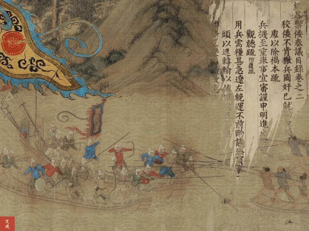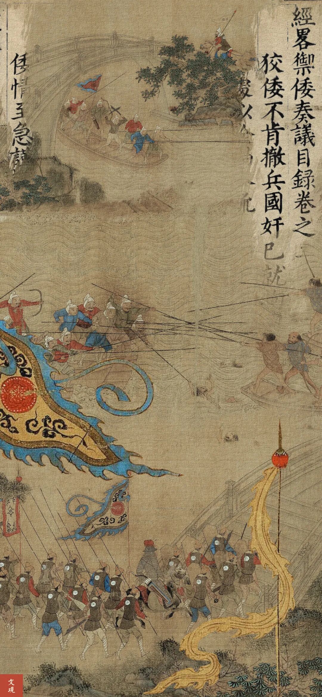 “《倭寇图卷》其描绘内容是明代靠海的长江沿岸的官军抗击倭寇的历史。全卷从右至左依次描绘:倭寇的船队出现、登岸、观望形势、掠夺防火、平民逃难、倭寇和明军士兵水上激战、倭寇被歼、明军出阵等内容”