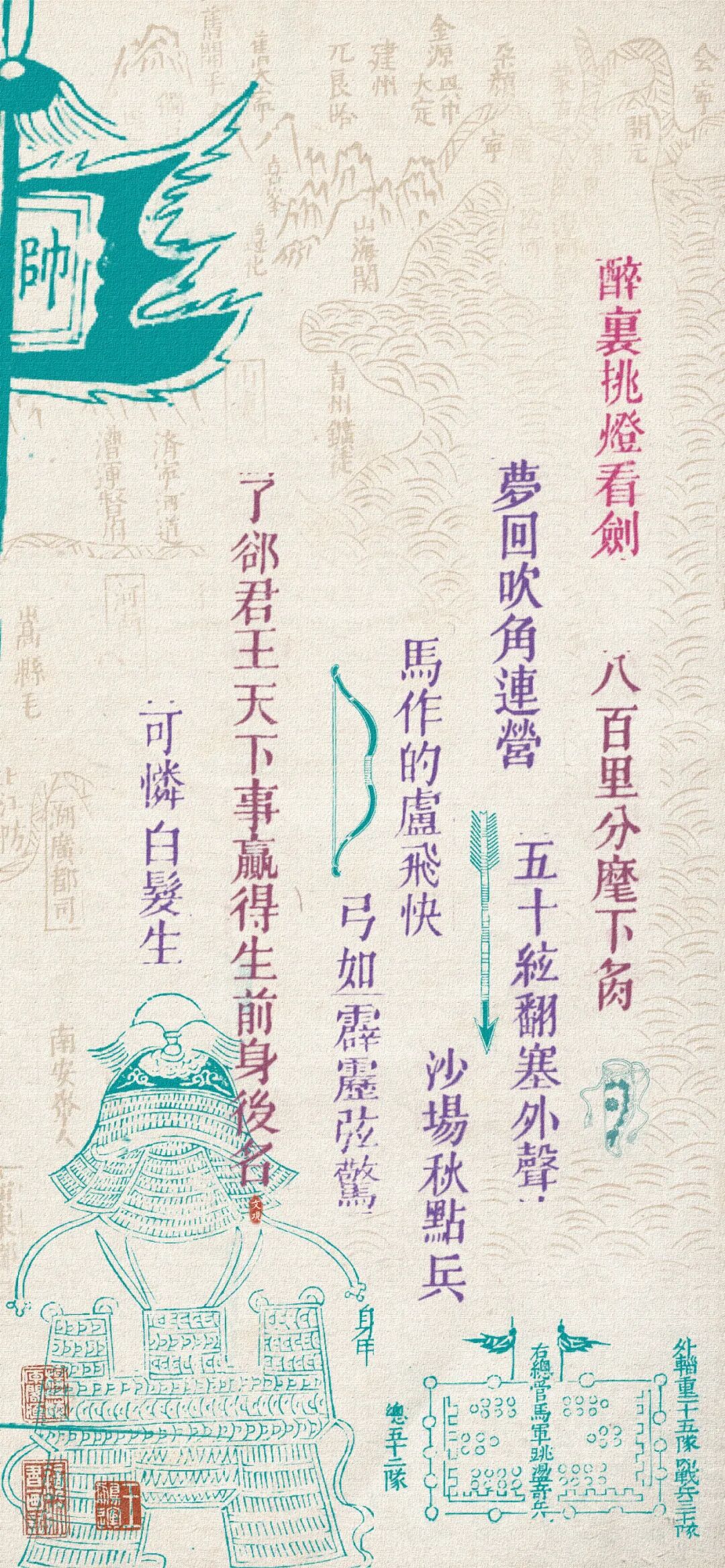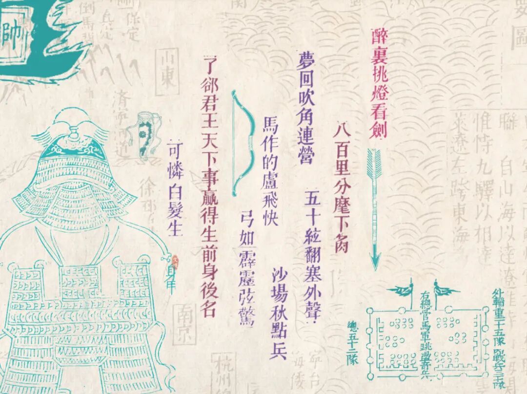 八百里分麾下炙,五十弦翻塞外声,沙场秋点兵。
