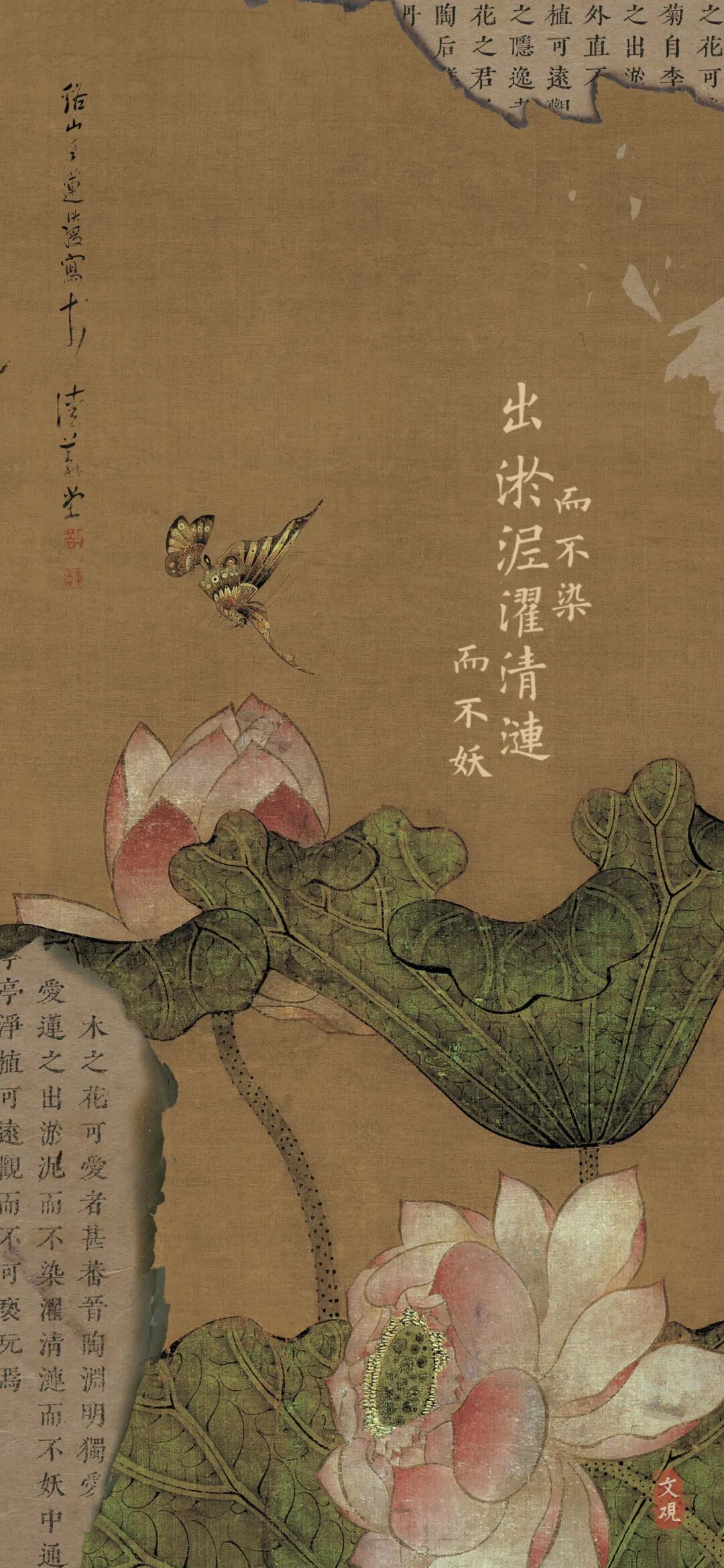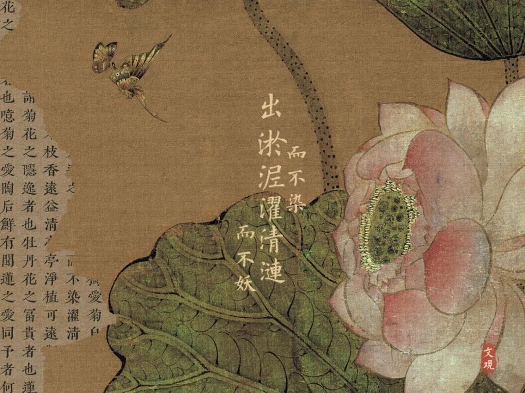 水陆草木之花,可爱者甚蕃。晋陶渊明独爱菊。自李唐来,世人甚爱牡丹。予独爱莲之出淤泥而不染,濯清涟而不妖,中通外直,不蔓不枝,香远益清,亭亭净植,可远观而不可亵玩焉。