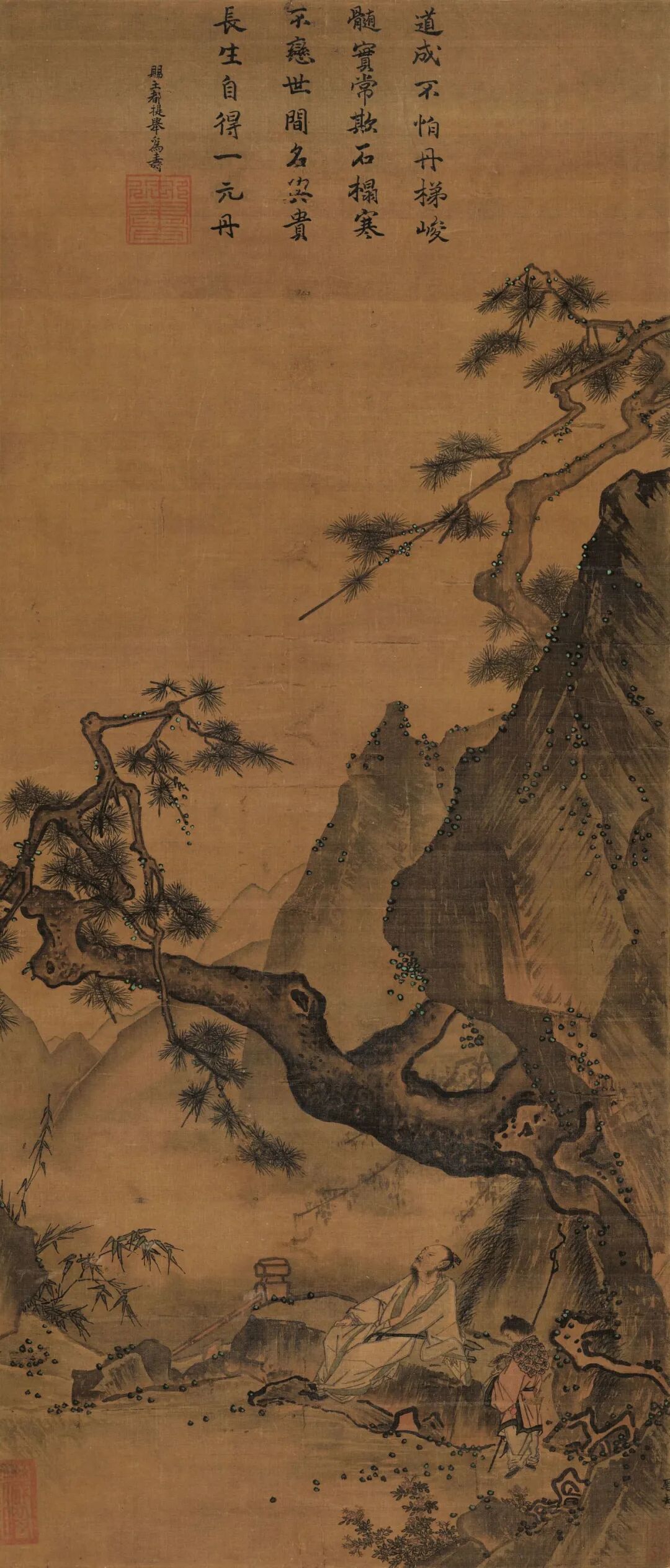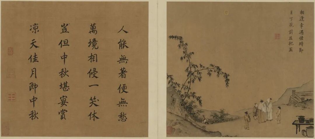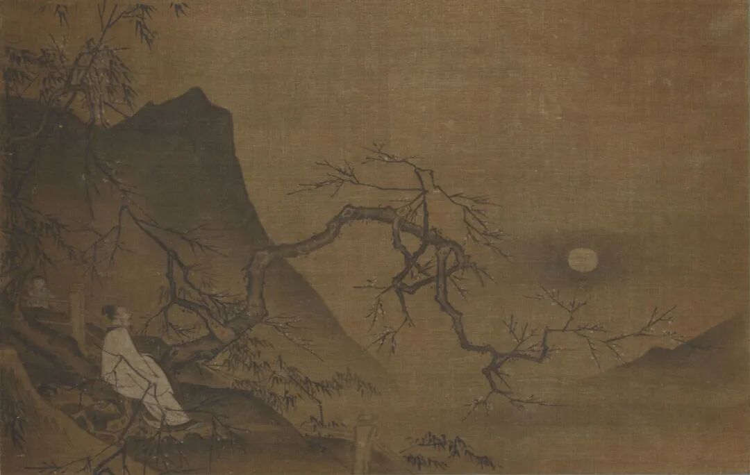 《对月图》颇具诗意,画一个文人在深山独酌,举杯做邀月状。图中夜山幽静,运笔痛快流畅,墨色深浅明暗对比明显,构图亦着重于一角,左实右虚,远近高低,相得益彰,意境深远。