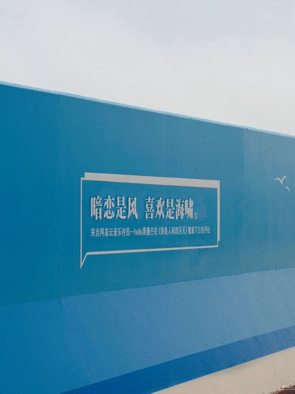 浅蓝色的堤坝,印着走心的文案,成为海边一道靓丽风景线,吸引无数人打卡。