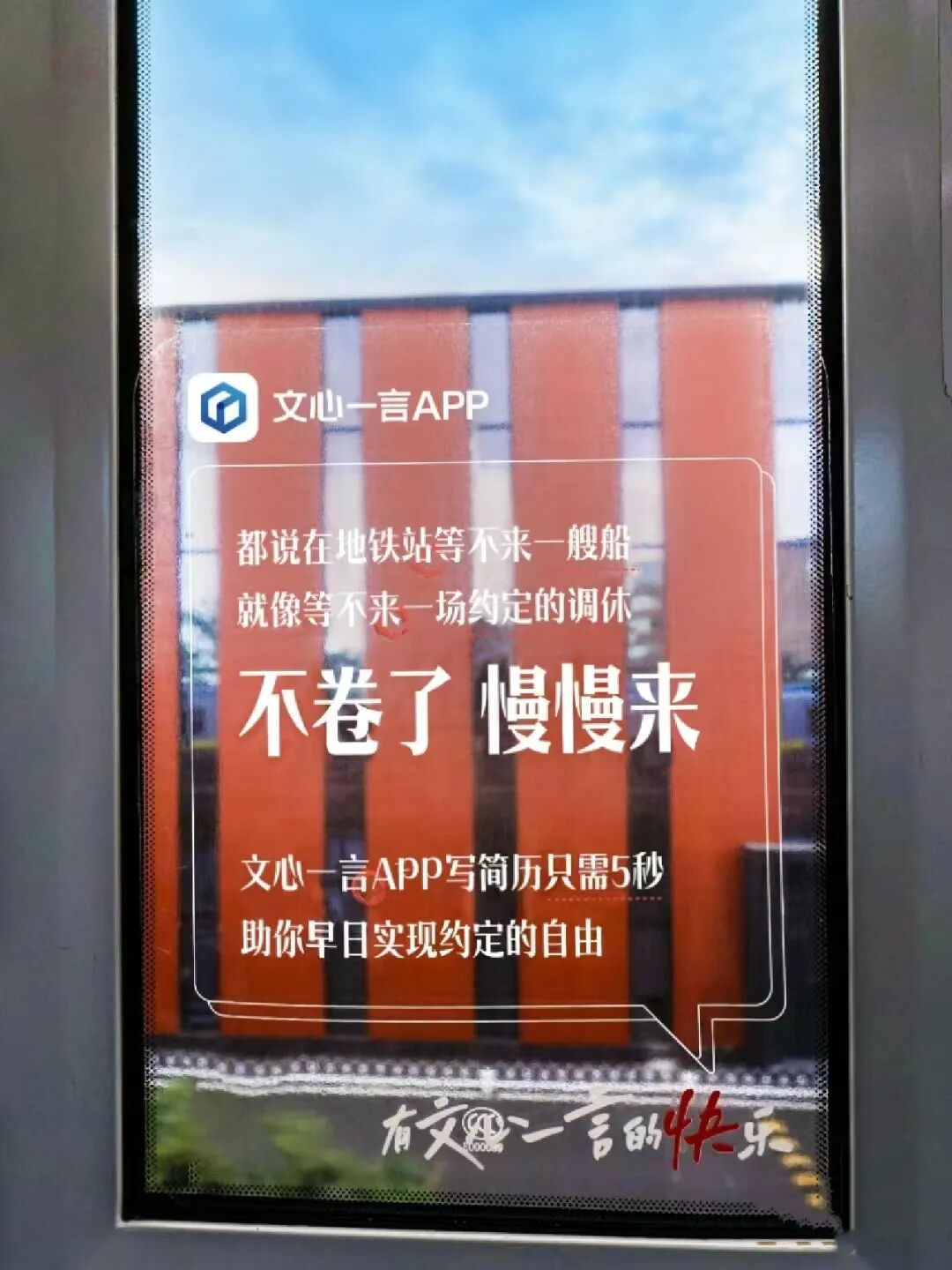 作为职场必备搭子,文心一言APP在打工人经常搭乘的北京地铁13号线,上线一组走心的车窗文案,希望帮助打工人有机会慢慢来,慢下来享受生活。