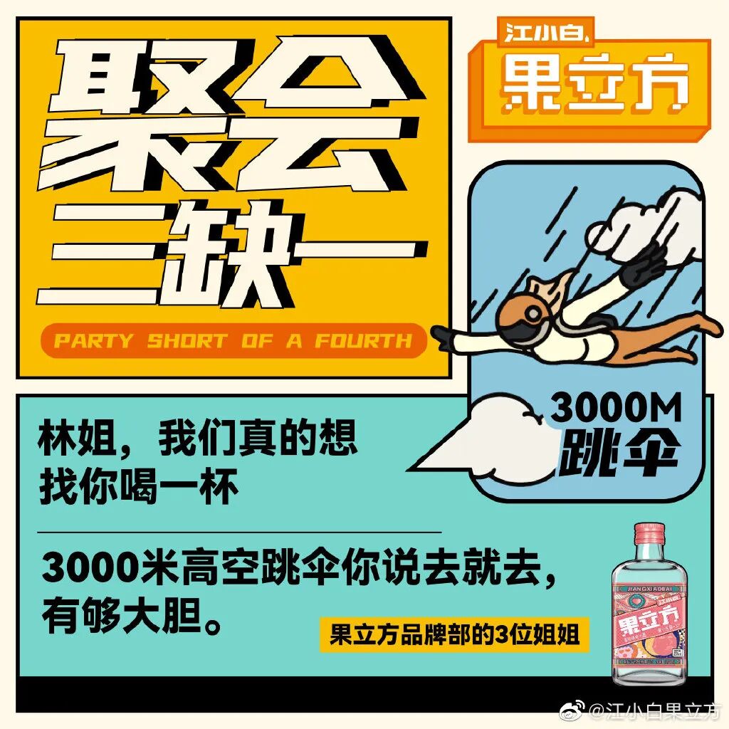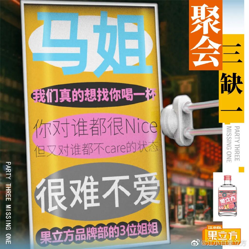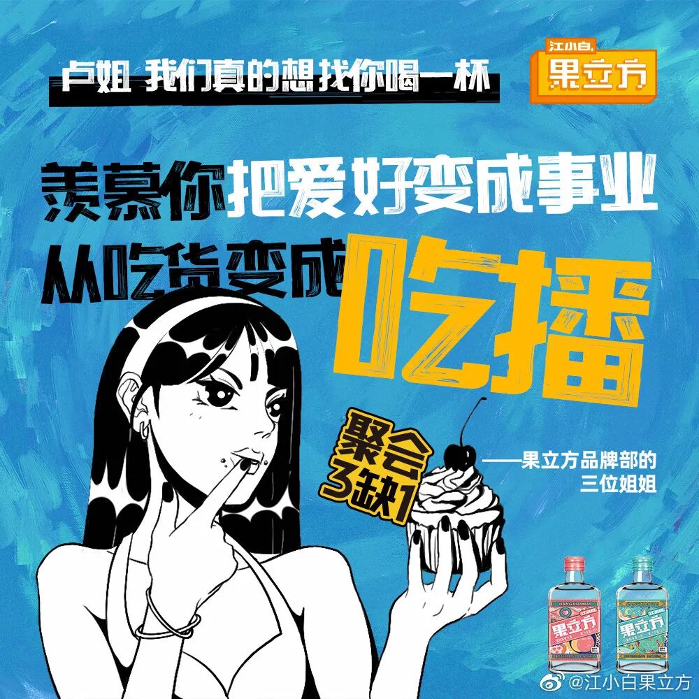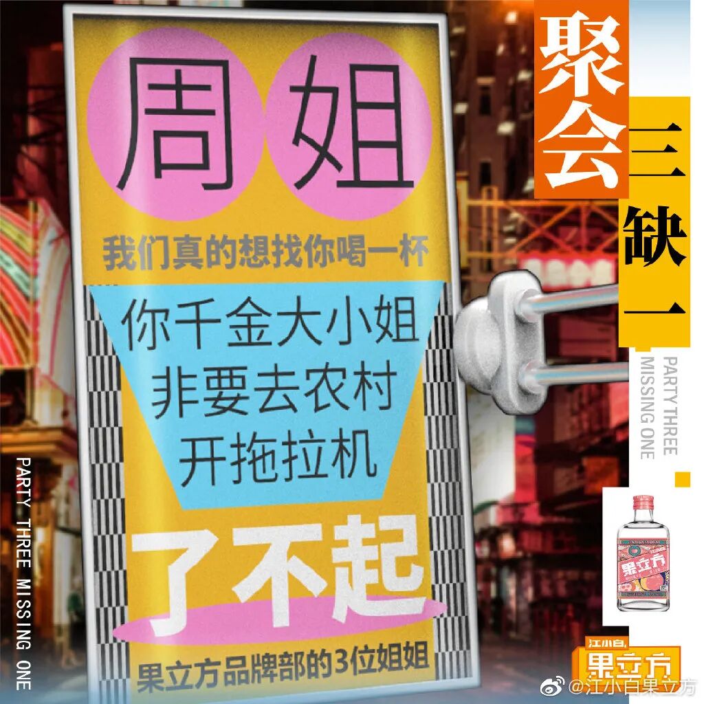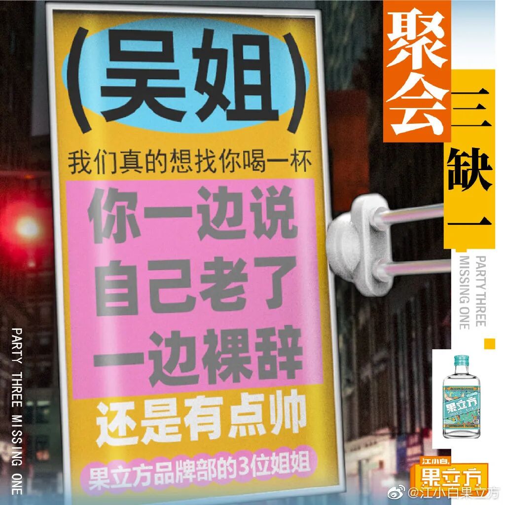 为了宣传造势,还以#聚会三缺一#,#喝果立方的姐姐好飒#为话题,把品牌部的3位姐姐拉出来写文案,在线摆酒局请姐姐们喝酒。