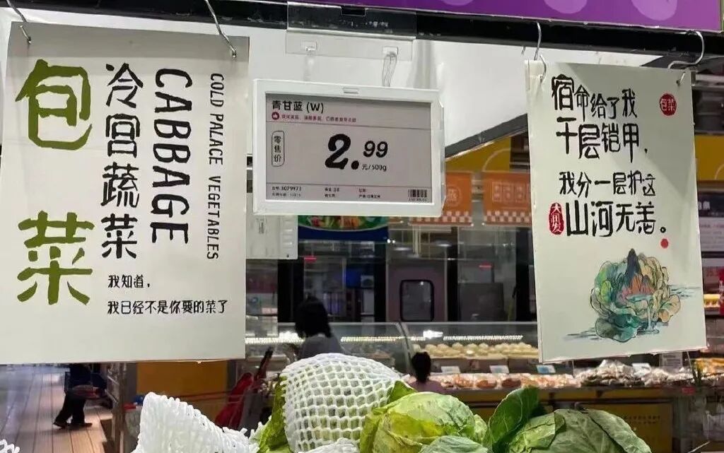出自上海大润发超市,最近,上海大润发文案登上热搜第一。原来不少网友发现在上海大润发超市的拟人化文案很有趣,有些蔬菜被打入了“冷宫”,有些商品被划入了“顶流”。