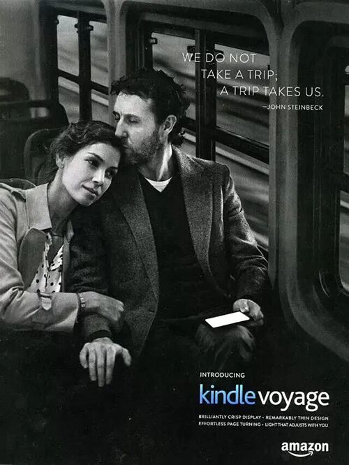 kindle Voyage刚上市时,亚马逊在海外推出一组黑白画风的平面广告。广告从“Voyage”(旅行)入手,选用简洁又富有深意的书籍引语作为广告文案。