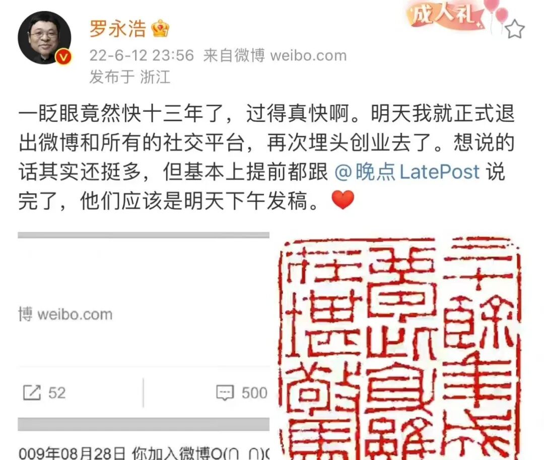 6月12日深夜,罗永浩发微博官宣即将于第二天正式退网,准备再度创业。