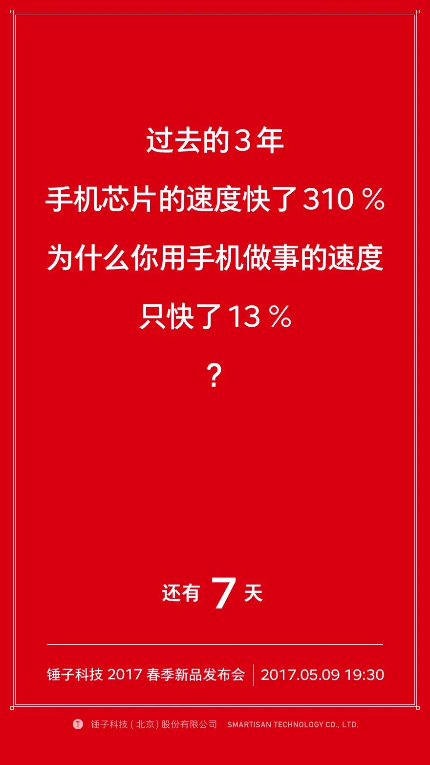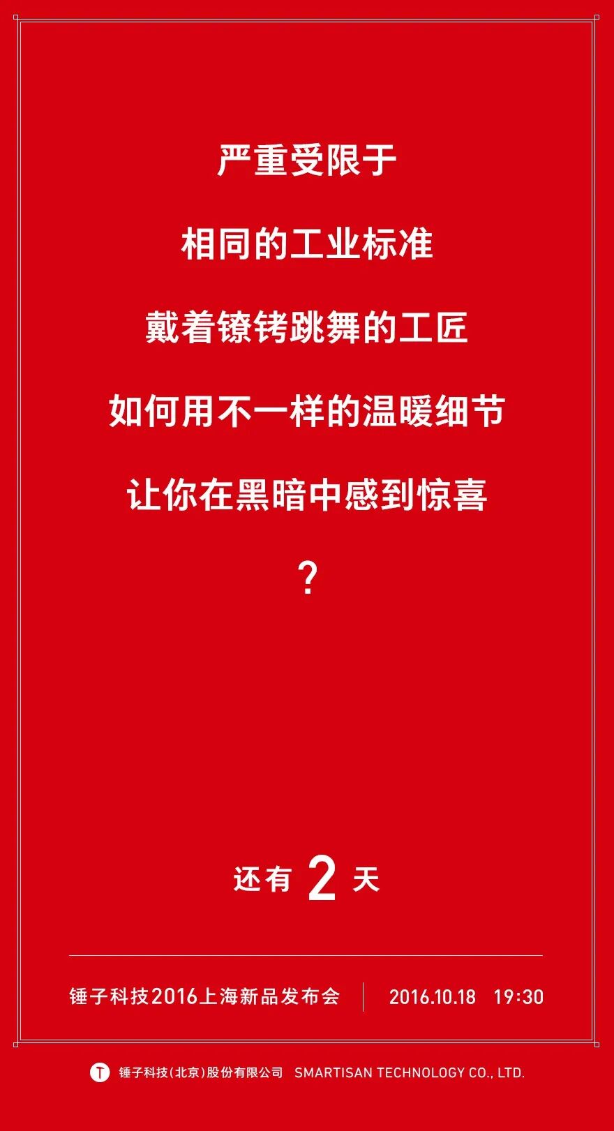 锤子科技新品T2发布会海报上的文案,这段文案体现了在经过两年市场风雨洗礼后的匠人依旧在坚持着心中的坚持。