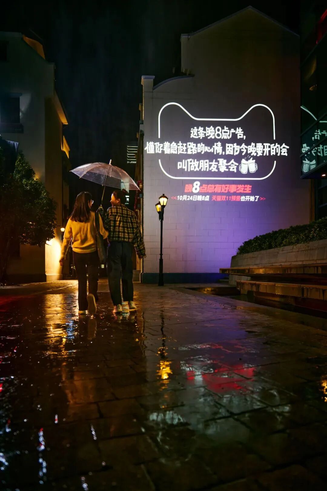 文案动人之外,媒介形式是一大创新点。天猫采用了移动投影的呈现形式,将一句句暖心文案,将晚8点会发生的好事映在人们的日常场景里。