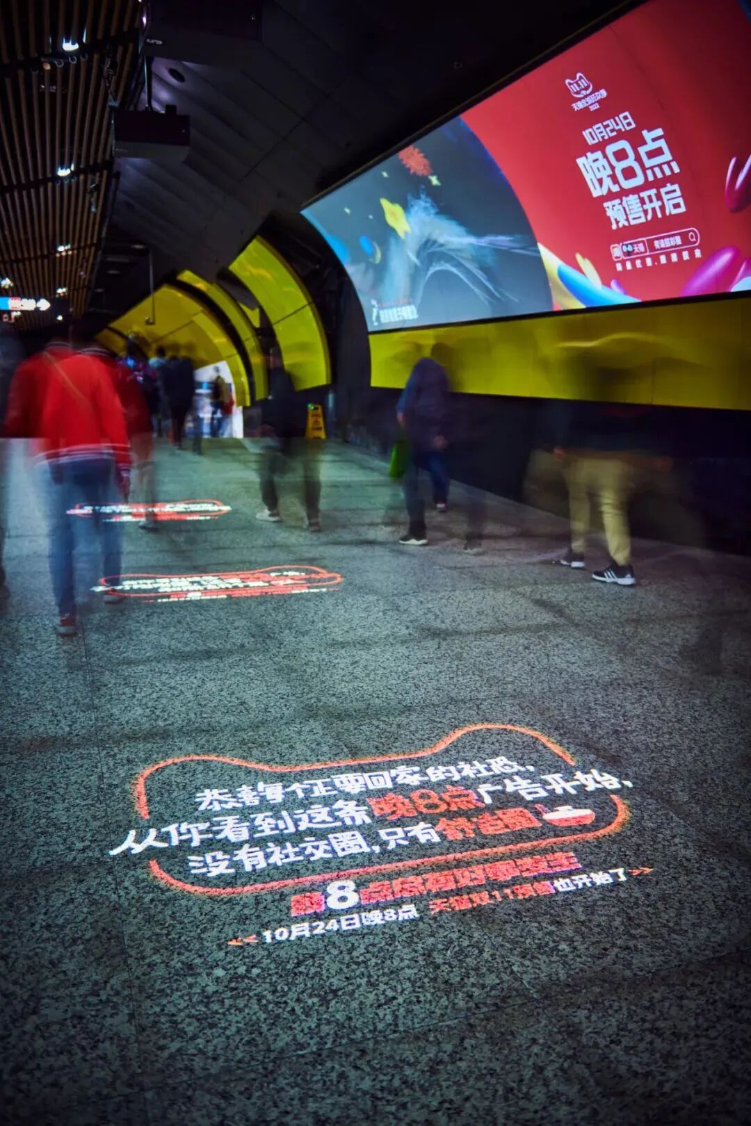 在上海、杭州、重庆三地,天猫分别在思南公馆、出租车、徐家汇地铁站、华元爱丁郡、老火锅店、北滨一路、胜天湖、弹子石广场、白象居阳台、东方国际广场10个地点投影。